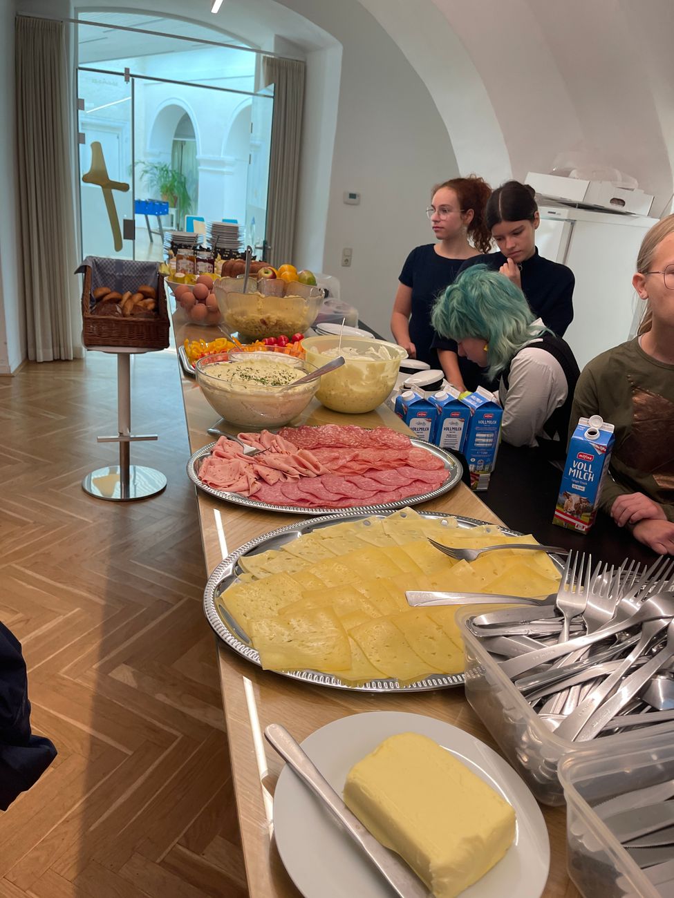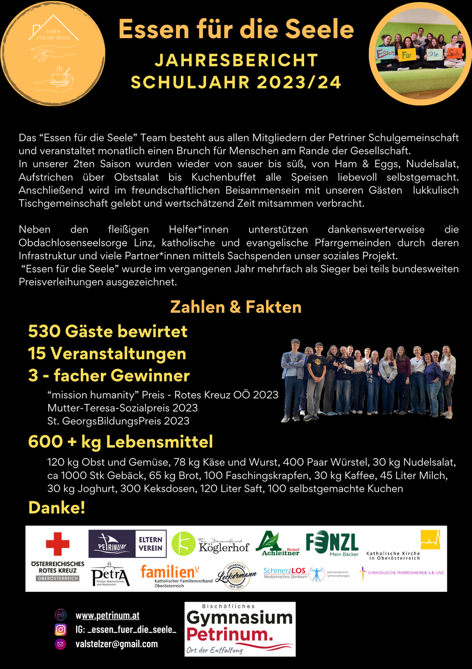 Hinter dem Projekt „Essen für die Seele“ steckt nicht nur großes Engagement unserer Schüler*innen, sondern auch viel organisatorische Arbeit: Von Überlegungen, wo die Treffen stattfinden können, bis zu der Frage, wie durch Spenden Essen organisiert werden kann. Die Lebensmittel sollen - wenn (finanziell) möglich - „bio“ und regional sein. Einerseits, weil es uns ein prinzipielles Anliegen ist, und andererseits, weil es auch eine Form der Wertschätzung den obdachlosen Menschen gegenüber ist qualitativ hochwertige Lebensmittel zu verwenden. Dankenswerterweise dürfen wir die perfekte Infrastruktur Linzer Pfarrheime für unsere Veranstaltungen verwenden. Die zu Hause vorbereiteten Speisen werden dort vor Ort liebevoll hergerichtet und den Gästen serviert.