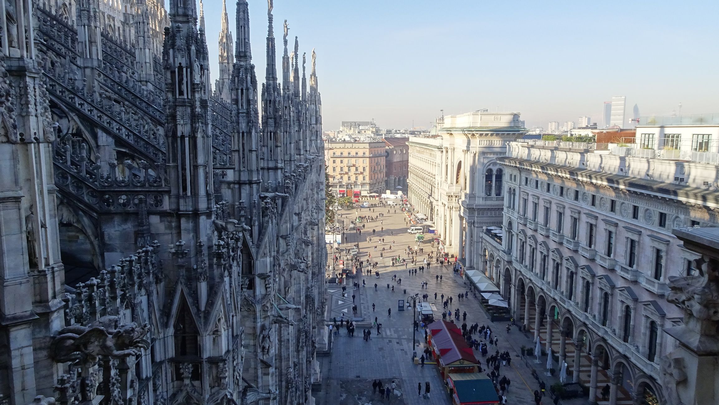 Doch viel Zeit blieb nicht, um sich auszuruhen, denn bereits um 9 Uhr hätten wir beim berühmten Mailänder Dom unsere Tickets zücken müssen. Mit etwas Verspätung schafften wir es auch dorthin und hatten die Möglichkeit, das Zentrum von Mailand aus der Höhe betrachten zu können – aufgrund einer ausstehenden Terrorwarnung war uns der Aufstieg bis nach ganz oben verweigert worden. Trotz dieser Komplikation war das bereits die lange Anreise wert.