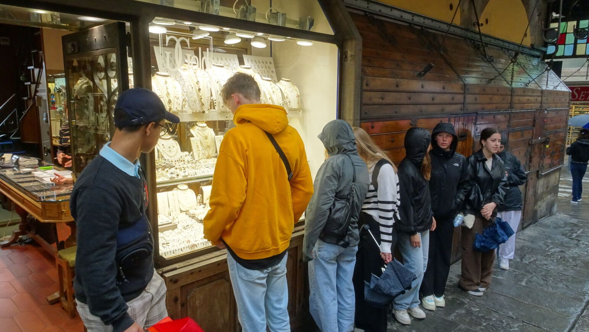 Wir besuchten am nächsten Tag die bekannte Galleria degli Uffizi. Dort bekamen wir die Chance, das weltberühmte Gemälde Botticellis „Die Geburt der Venus“ zu sehen und viele weitere Kunstwerke der Künstler Michelangelo, Leonardo da Vinci, Caravaggio usw. (Definitiv eines meiner persönlichen Highlights dieser Reise!). Noch am selben Tag besichtigten wir ebenfalls den Ponte Vecchio, eine der ältesten Brücken dieser Art, auf der tatsächlich einst Leute gearbeitet und gewohnt haben und die heute eine Art Einkaufsstraße für High Luxury Brands ist. Die ganze Brücke war wegen des starken Regens voll mit beschirmten Menschen, was ein schönes Bild bot.