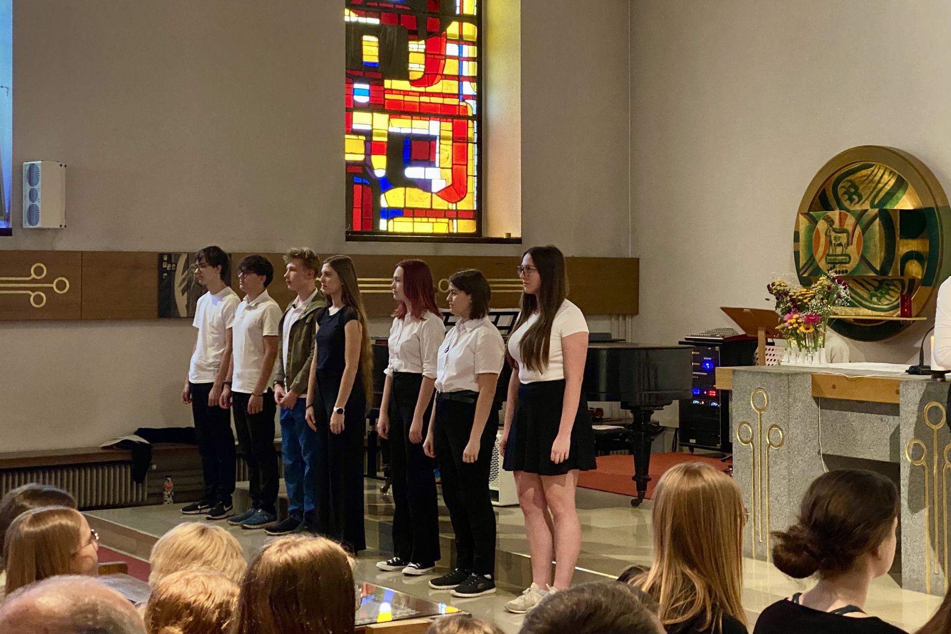 Zum dritten Mal in diesem Schuljahr wurde zur Petriner Hausmesse geladen. Und zum dritten Mal folgten viele dieser Einladung. Sehr viele, um genau zu sein, denn die Schüler*innen aus den ersten, fünften und sechsten Klassen, die unter der Leitung von Mag.a Tanzler für die musikalische Gestaltung sorgten, hatten die Freude vor vollem Haus singen und spielen zu dürfen. Das hatten sie sich auch redlich verdient: Egal ob klassisches Liedgut, englische Balladen oder Soul/alternative Rock, alles wurde souverän dargeboten. Ganz zu schweigen von den instrumentalen Stücken, bei denen die Klasse der Schüler*innen deutlich sichtbar wurde. An dieser Stelle ganz herzlichen Dank an alle Schüler*innen, Kollegin Tanzler, Kollegen Altkind an der Orgel und die Eltern Vera Kral und Daniela Mülleder, die zur Unterstützung mitgespielt haben.