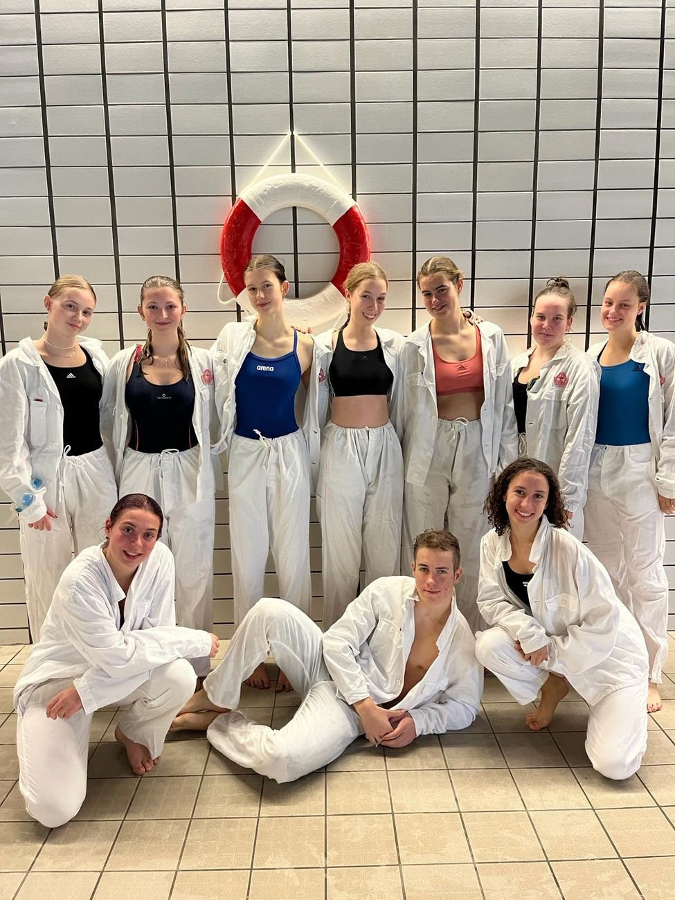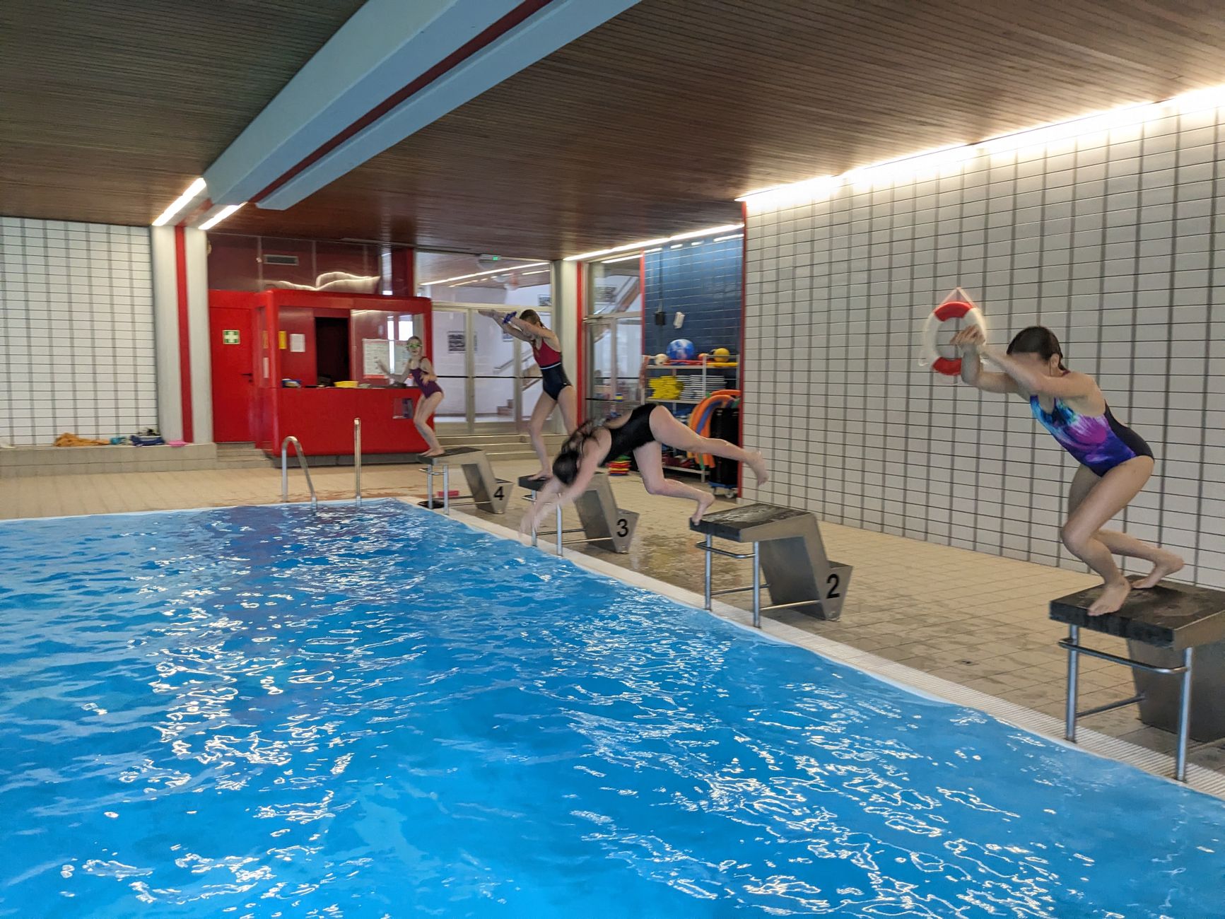 Während die ersten Jahre des Schwimmunterrichts vorwiegend dem Erlernen der Hauptschwimmarten Kraul, Brust und Rücken dienen, geht es für die Fortgeschrittenen auch darum, anderen im Ernstfall helfen zu können. Die Übung mit verschiedenen Rettungsgeräten, das Schwimmen in Überkleidern oder sehr ausdauernde Schwimmeinheiten sollen das ermöglichen. Der Erfolg beim Erwerb der Rettungsschwimmabzeichen bestätigt den Schüler:innen dann auch außerhalb der Schule ihre Fähigkeiten. Besonders erfreulich ist auch, dass sich jedes Jahr eine Gruppe der Oberstufenschüler:innen findet, die gemeinsam die Ausbildung zum Rettungsschwimmer absolviert.