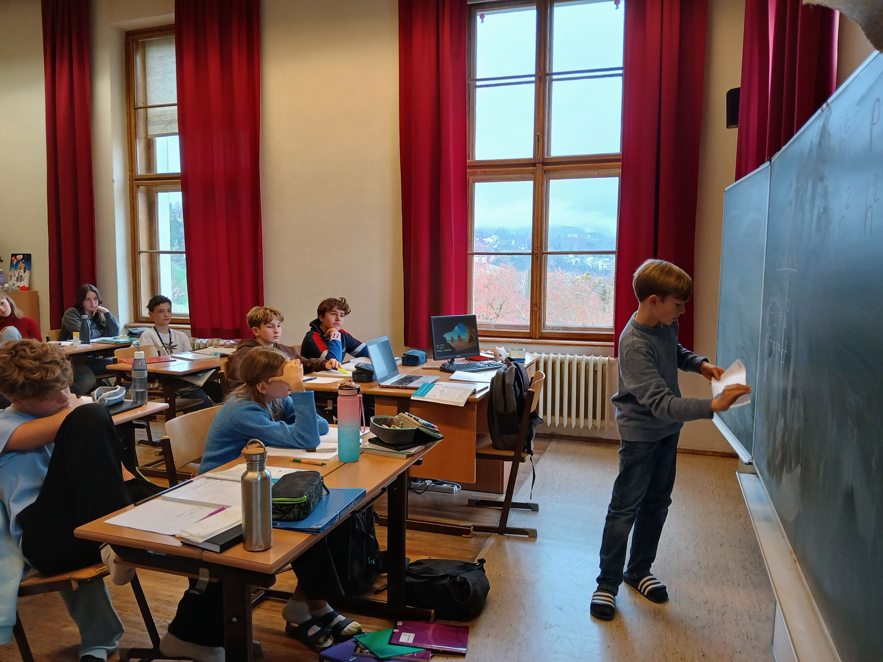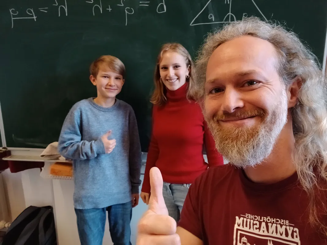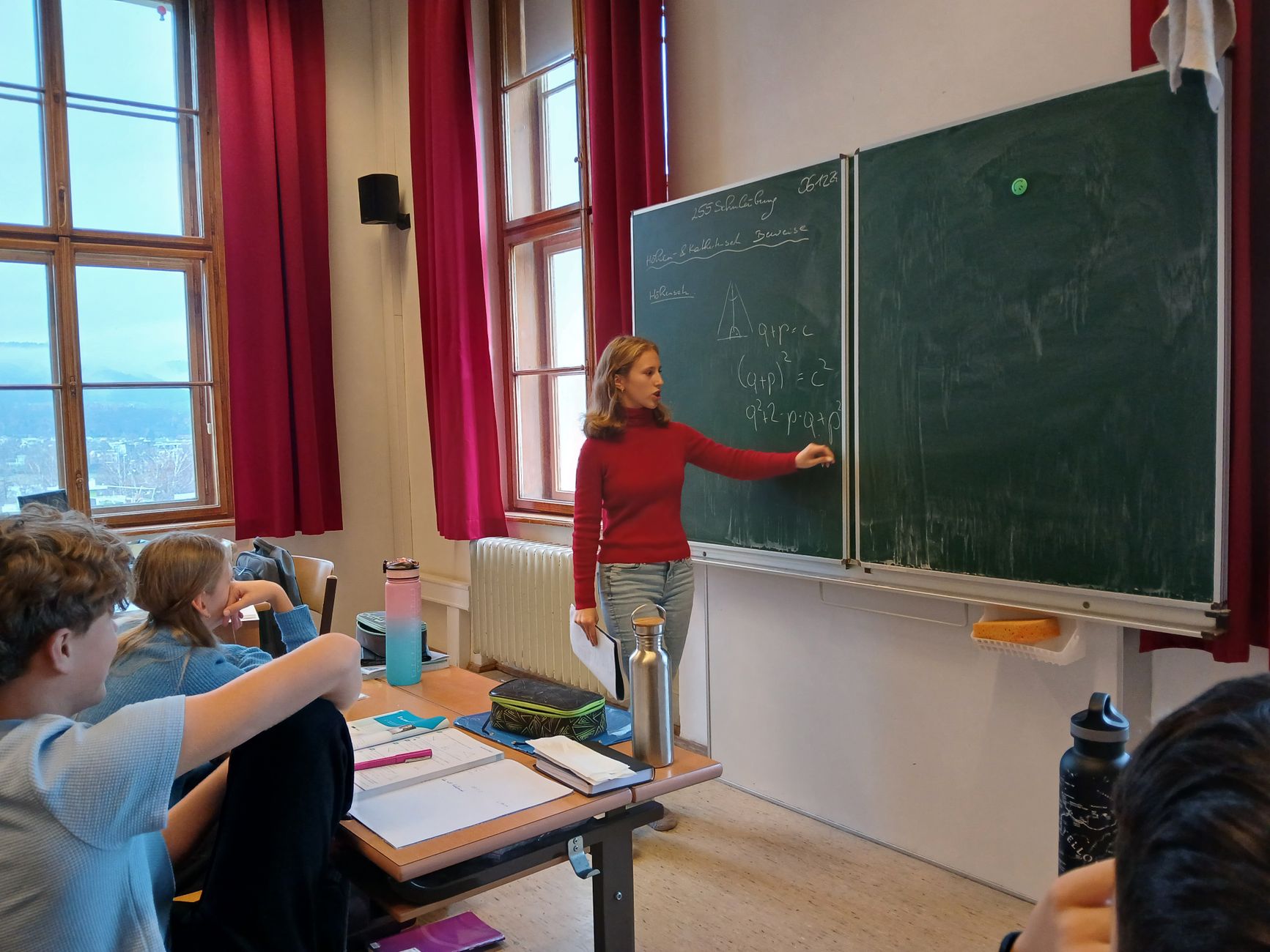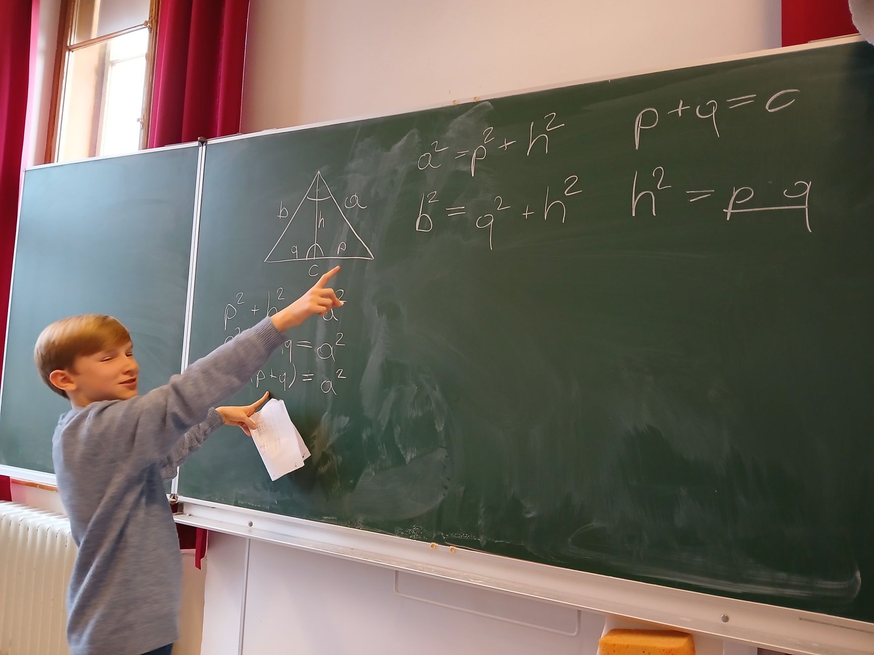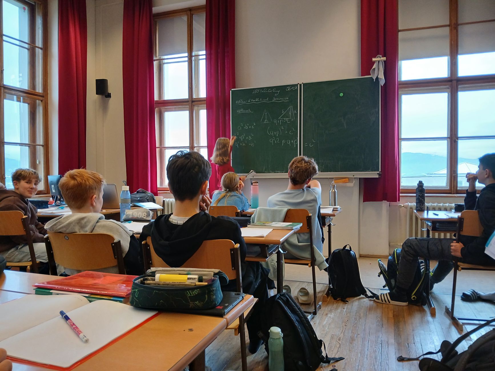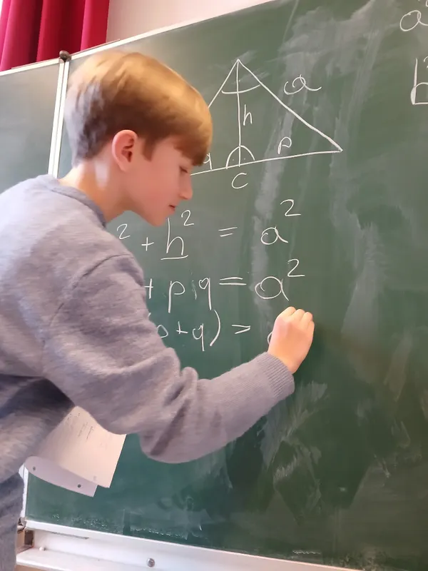 Im Mathematikunterricht einfach brav in der Bank sitzen und mitschreiben, das muss nicht sein. Auch nicht, wenn es um das Herzstück des Mathematikunterrichts geht: Beweise. Rosalie und Sebastian schlüpften daher in die Rolle der Lehrperson, schnappten sich die Kreide und bewiesen ihren Kolleg*innen gleich Dreierlei: Erstens, dass Höhen- und die Kathetensatz nicht einfach vom Himmel fallen. Zweitens, dass Beweise auch selber machbar sind. Und drittens, dass sie sogar Spaß machen können. Gratulation an euch zwei, ihr habt das toll gelöst!