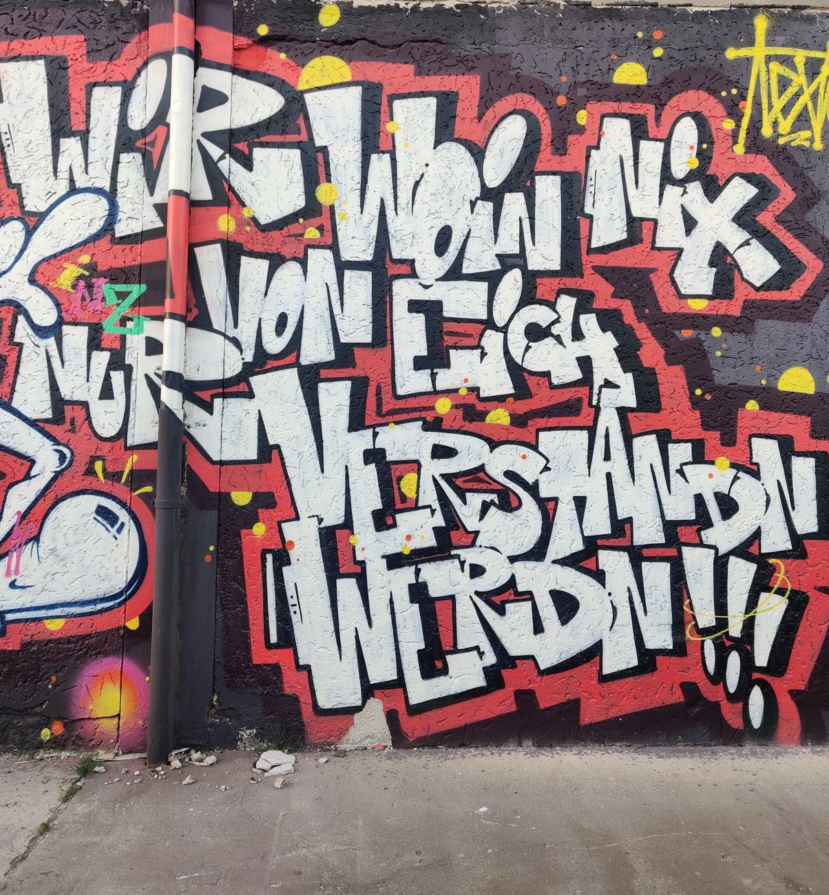 "Wir woin nix von eich, nur verstandn werdn" prangt in großen Lettern an der Wand im Linzer Hafen, im Mural Harbour, der größten Graffiti-Galerie in Europa.