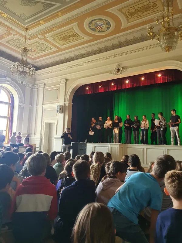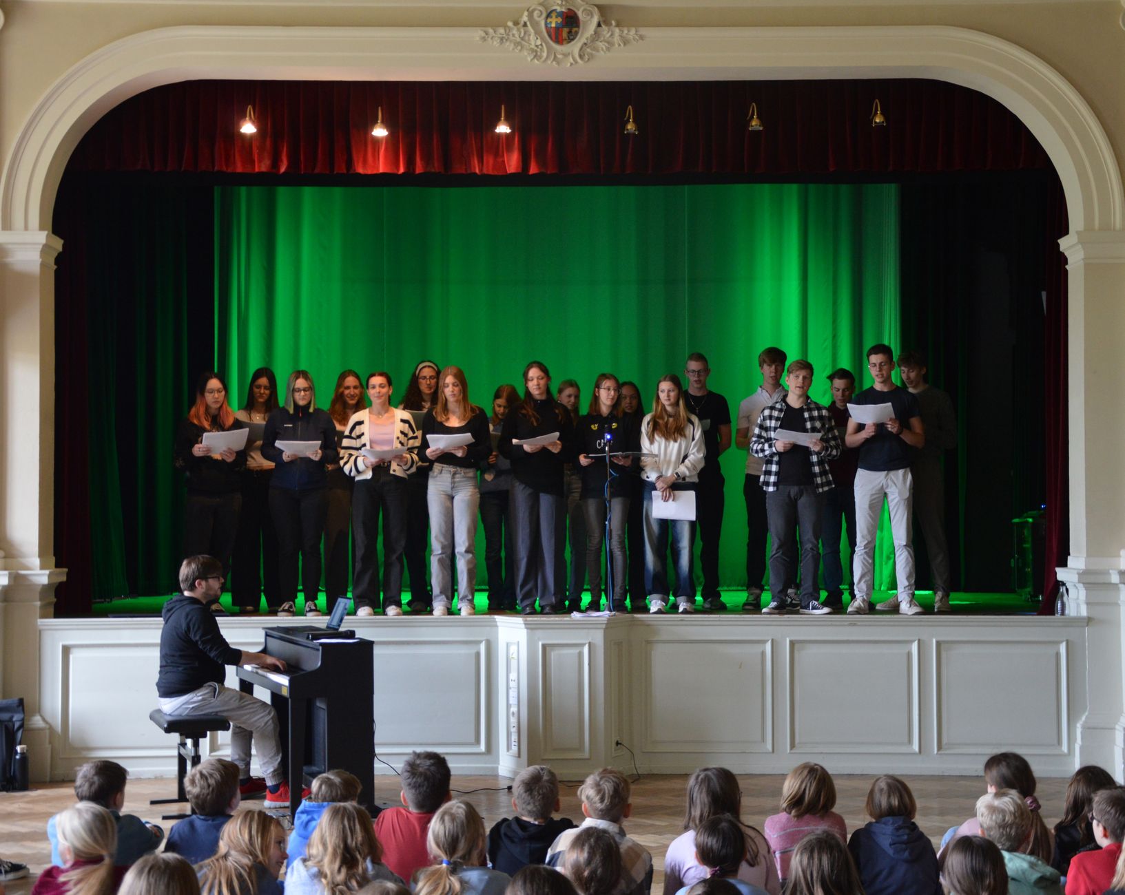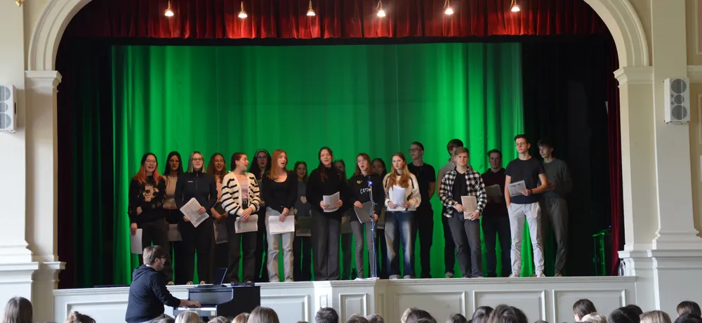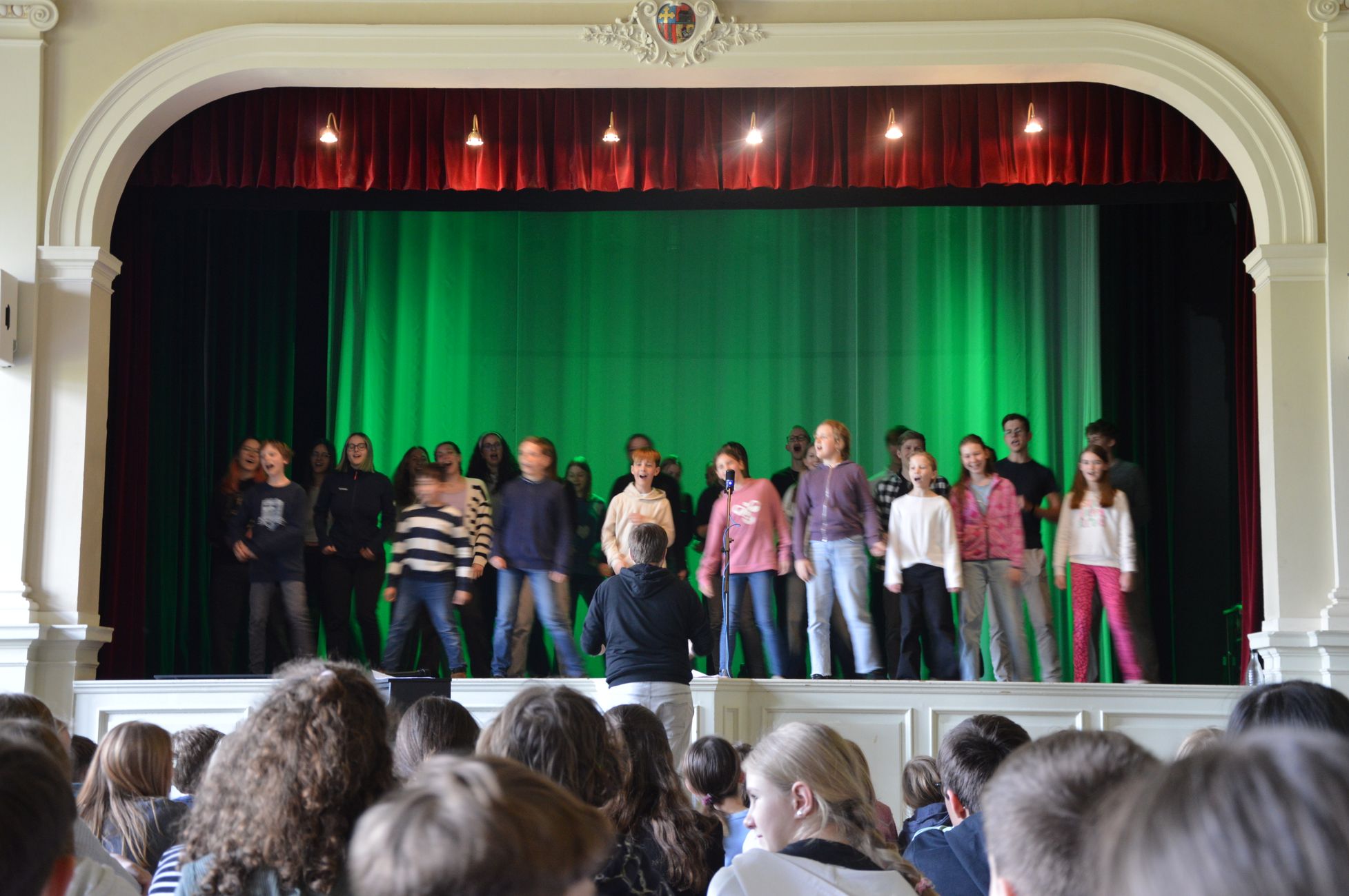 Die Schülerinnen und Schüler der Musikgruppe der heurigen 8.Klassen haben sich in den vergangenen anderthalb Jahren zu einem beachtlichen Chor-Klangkörper entwickelt. Die Anfänge davon konnten wir bereits im letzten Jahr im Zuge des Landesjugendsingens, bei diversen Messgestaltungen und auch im Rahmen eines Schulkonzerts präsentieren.Nachdem sich aber nun die Schulzeit dem Ende neigte und auch dieser Chor als Ganzes so schnell nicht wieder zusammenkommen wird, war es Zeit, einen musikalischen Abschied zu zelebrieren.Unterstützt vom Chor der Unterstufe, bestehend aus Schüler*innen der 1. und 2. Klassen, gab es im Festsaal einen musikalischen Querschnitt durch die chorische Arbeit. Mitreißende afrikanische Musik mit Bewegungs-Choreographie durfte genau so wenig fehlen wie Popsong-Arrangements. DANKE nicht nur an alle Beteiligten, sondern auch an alle Klassen und Lehrpersonen im Publikum!