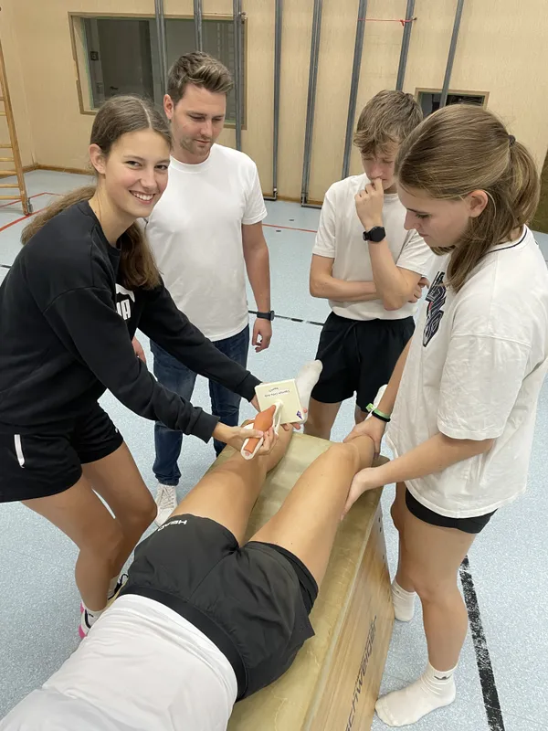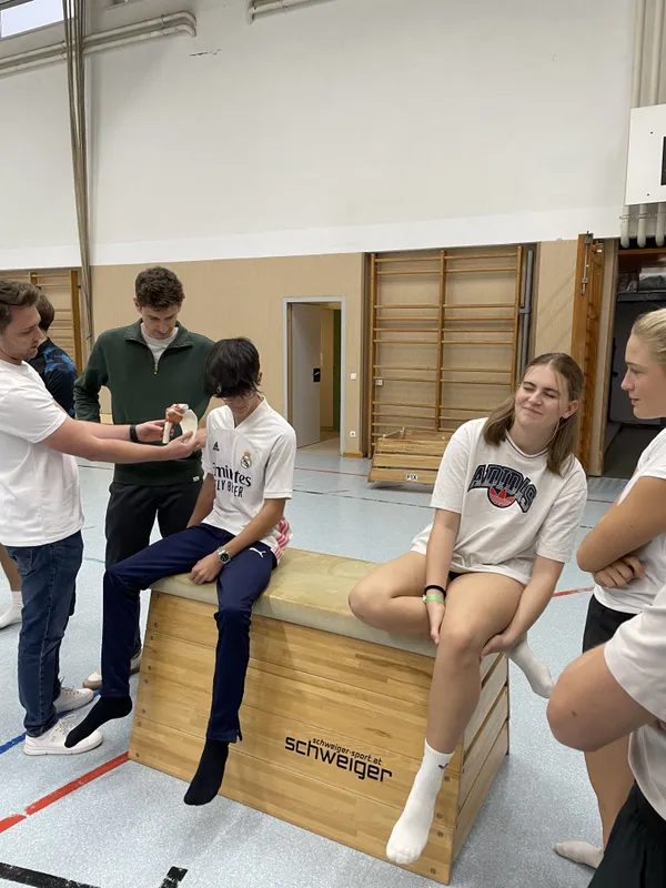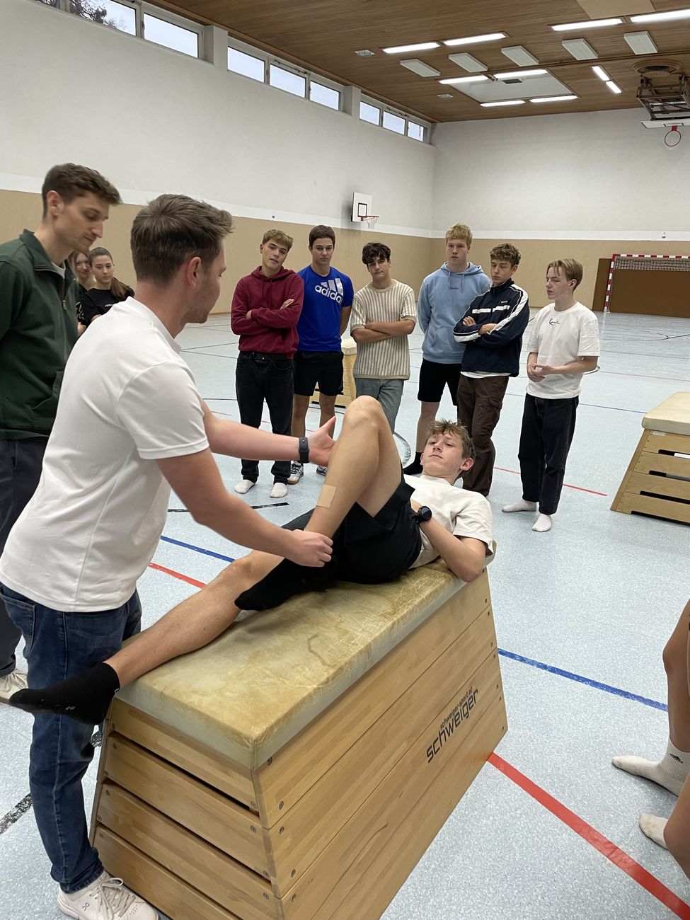 Auf diese Fragen und noch zahlreiche weitere erhielten die Schülerinnen und Schüler des WPG Sportkunde in einer Doppelstunde fachkundige Antworten. Ein Besuch vom Altpetriner Timo Streibl sowie Thomas Haring, beide Ärzte am Kepler Uniklinikum, ermöglichte spannende Einblicke in das breite Aufgabenspektrum der Sportmedizin. Nach einer allgemeinen Einführung zur Interdisziplinarität dieser Fachrichtung und der Zusammenarbeit verschiedenster Gesundheitsberufe wurde anhand von anatomischen Modellen konkrete Sportverletzungen und deren Behandlung durchbesprochen sowie die Diagnostik erläutert. Den Abschluss des überaus spannenden Workshops bildeten verschiedene Gelenksuntersuchungen, die die Schülerinnen und Schüler selbst durchführten. Glücklicherweise wurden in der Gruppe lauter gesunde Gelenke vorgefunden und keine Verletzungen festgestellt.