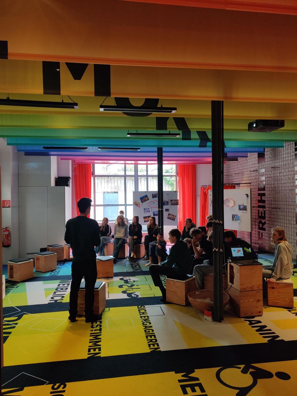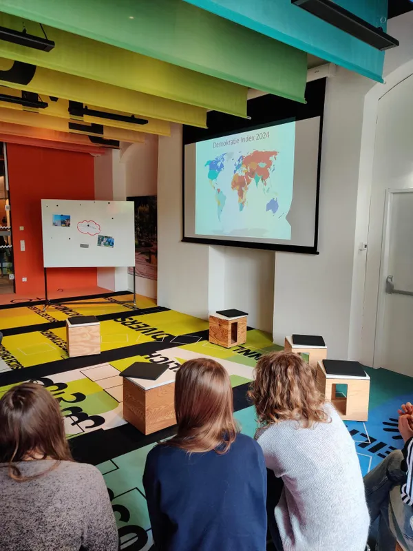 DEMOKRATIE steht in großen Letter auf bunten Stoffbahnen an der Decke des Museums Arbeitswelt in Steyr. Demokratie schwebt über allem. Und trotzdem ist sie nicht selbstverständlich. Was das große Gut bedeutet, wie man es bewahrt und vor allem zu schätzen lernt, das lernten die SchülerInnen der 5. Klassen am Freitag in Steyr.