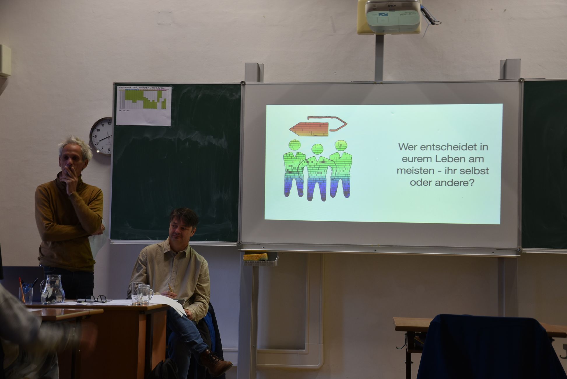 Nach einer theoretischen Bestimmung demokratiepolitischer Fundamente stand die Visualisierung kurzer Geschichten am Programm. Die beiden Workshopleiter begleiteten die Schülerinnen und Schüler kompetent bei der Ausarbeitung ihrer Ideen und deren filmische Umsetzung. Die so entstandenen Videoclips greifen auf prägnante und witzige Art das Erlebnis unfairer Beurteilung und das Scheitern dominant-autoritärer Haltungen auf.