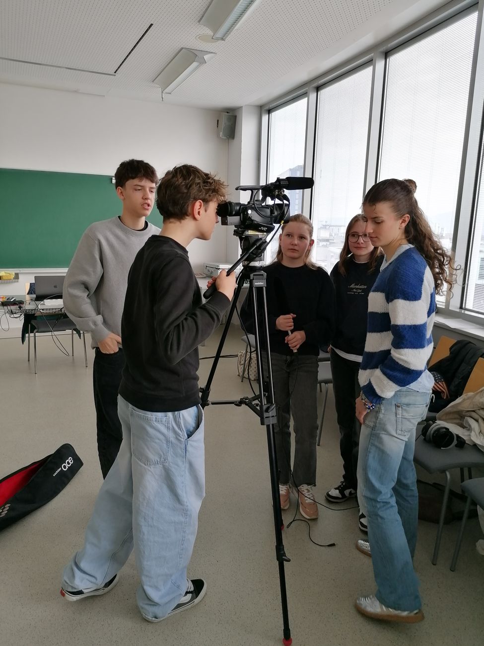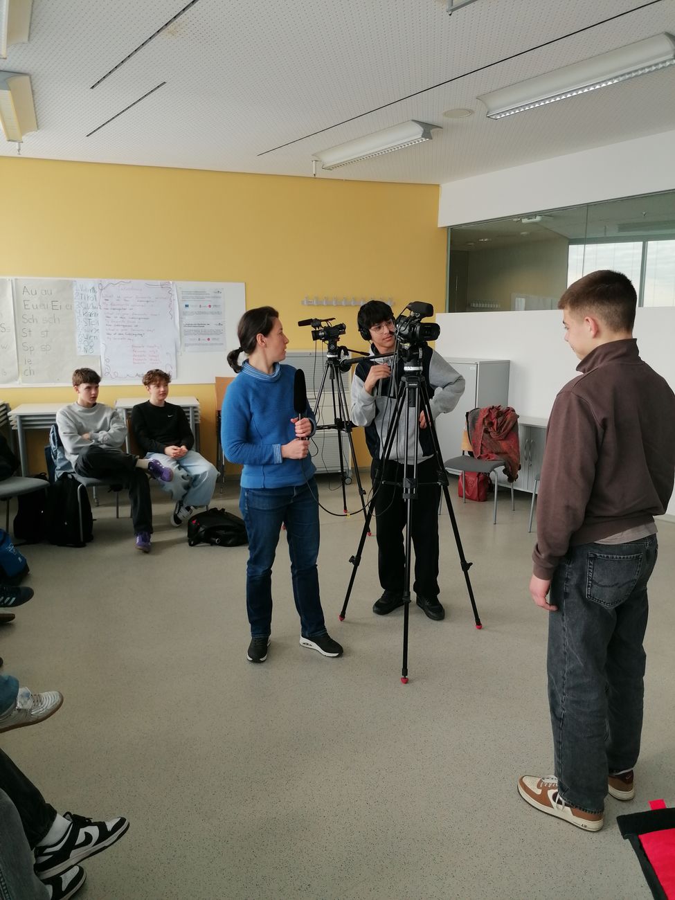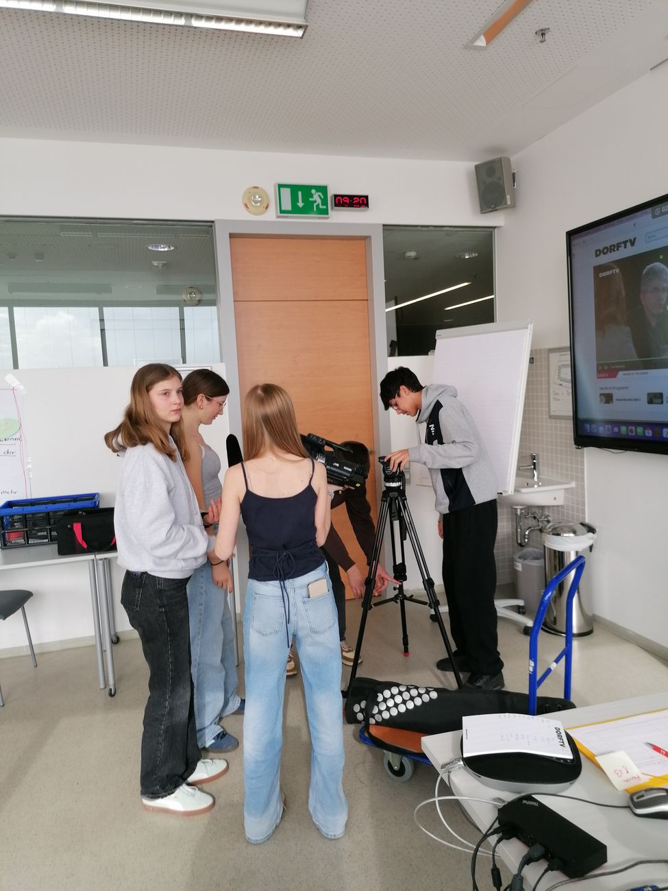 Im Rahmen eines ganztägigen TV-Workshops, der am 9. April 2025 bei DORFTV stattfand, gestalteten die Schülerinnen und Schüler der 4C Beiträge mit Straßenumfragen zu den Themen „Feminismus“ und „Neues Pfandsystem“.