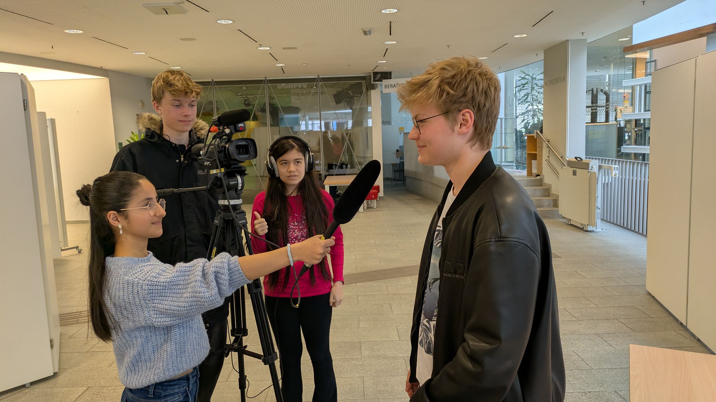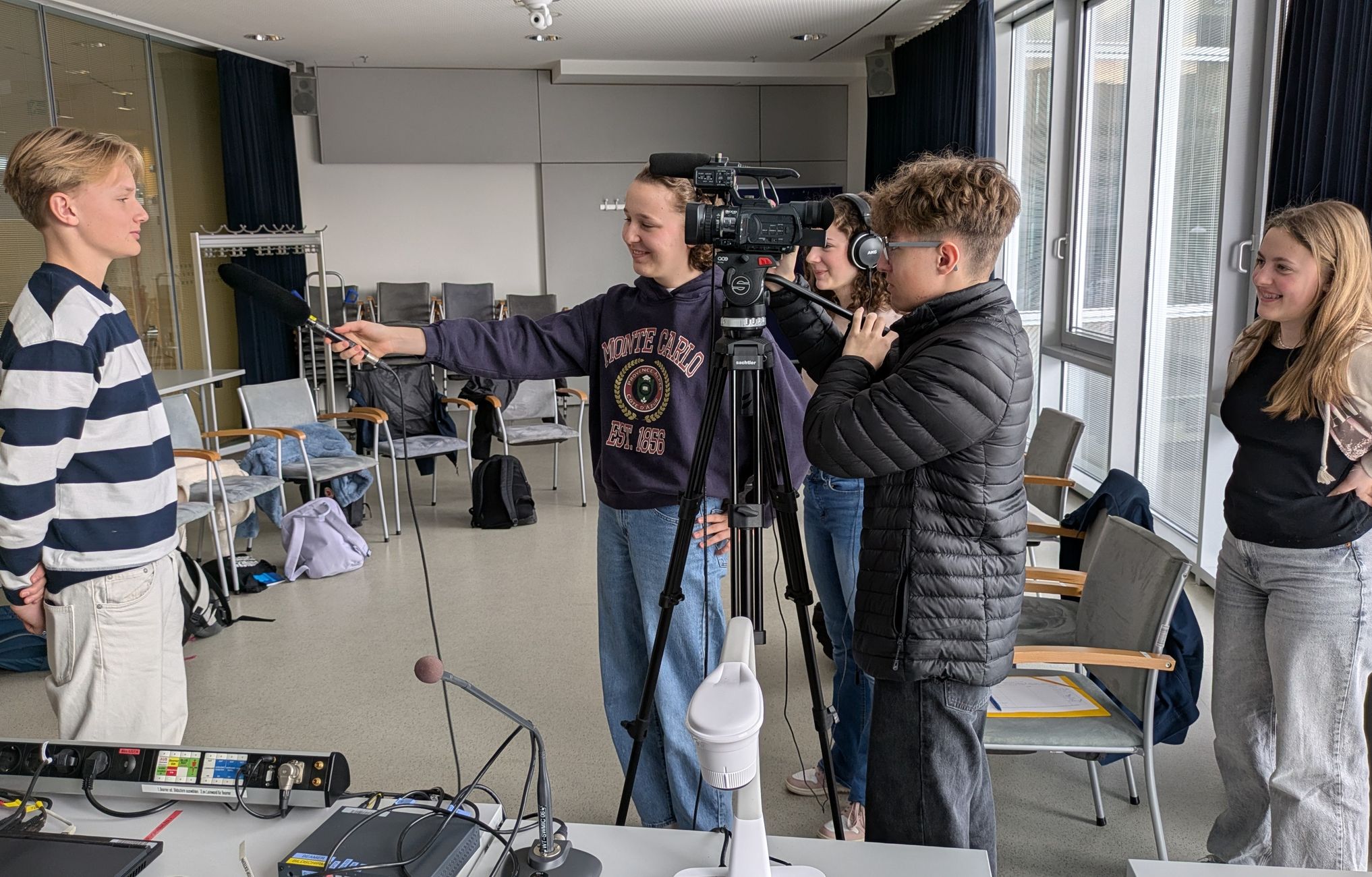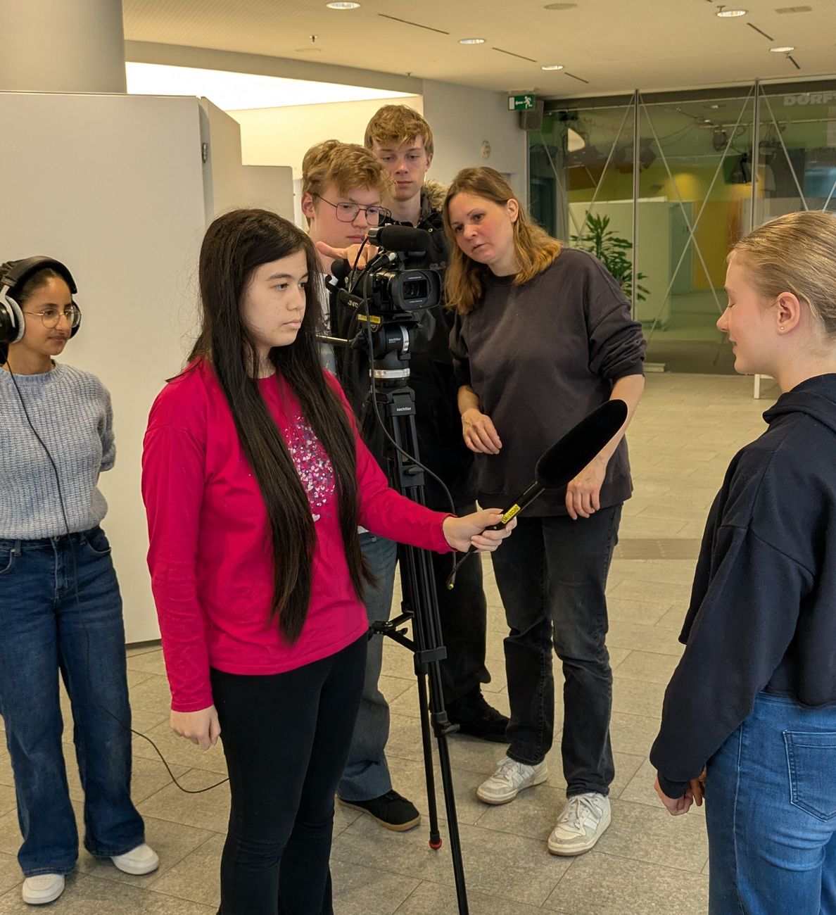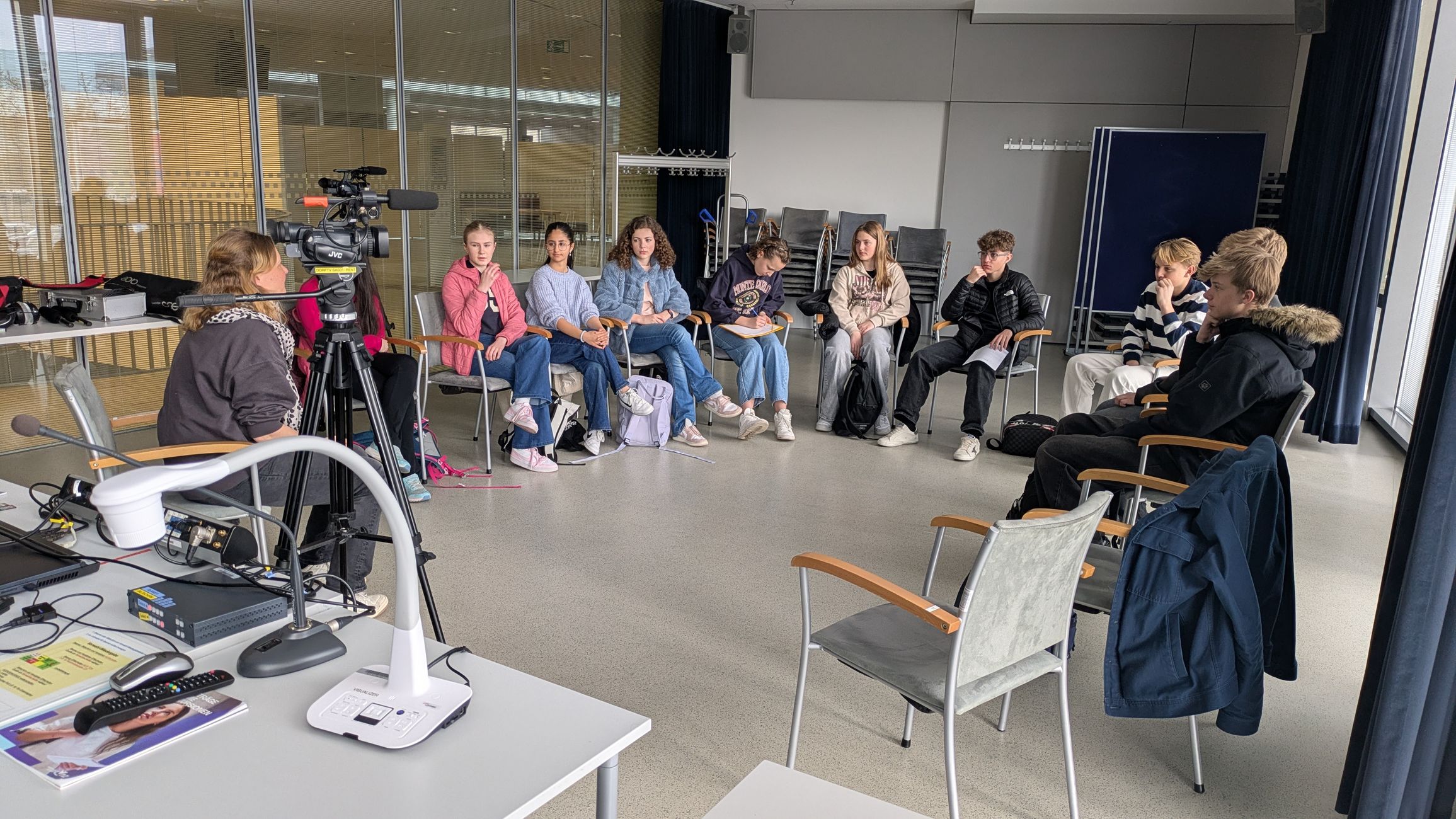 Im Rahmen eines ganztägigen TV-Workshops, der am 9. April 2025 bei DORFTV stattfand, gestalteten die Schülerinnen und Schüler der 4C Beiträge mit Straßenumfragen zu den Themen „Feminismus“ und „Neues Pfandsystem“.