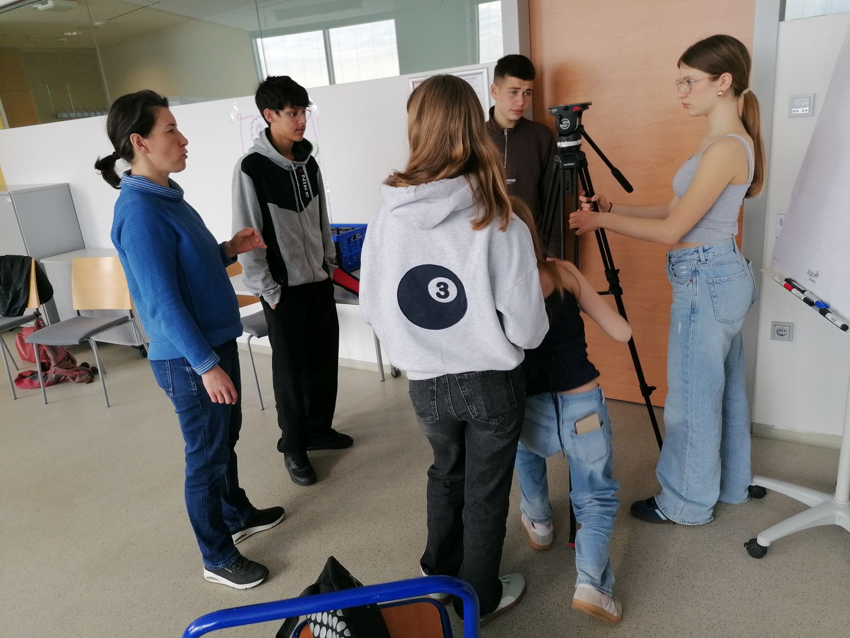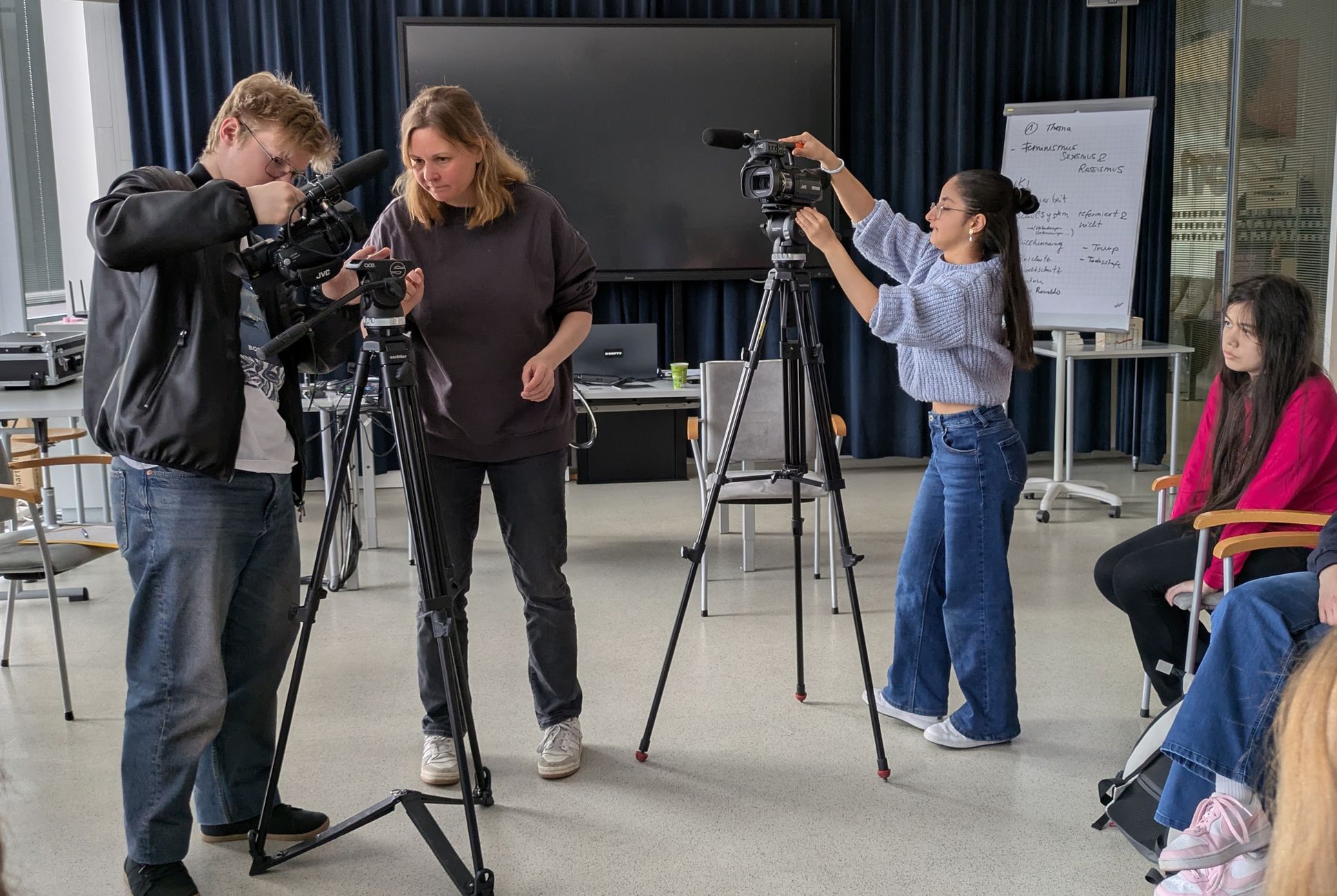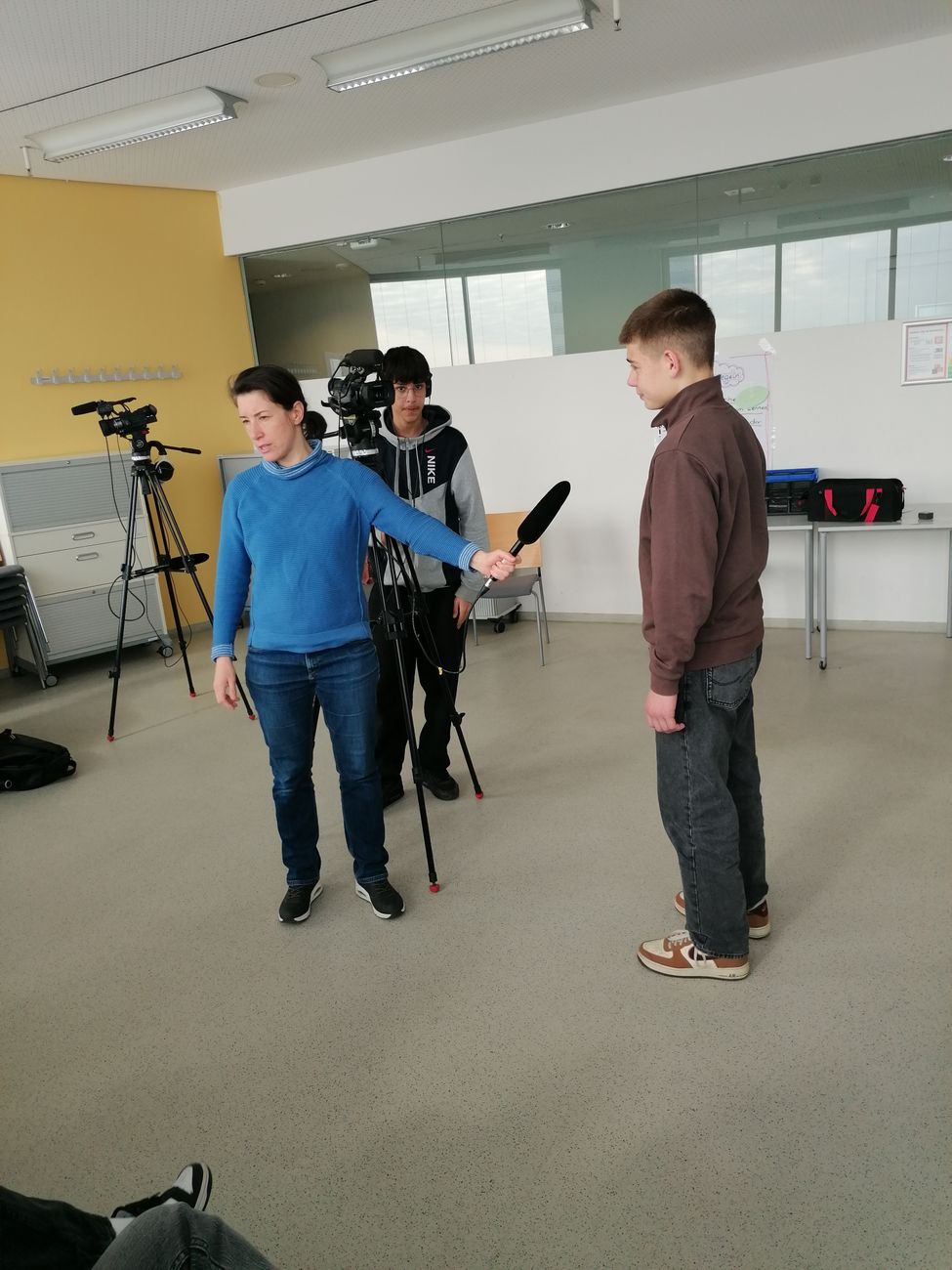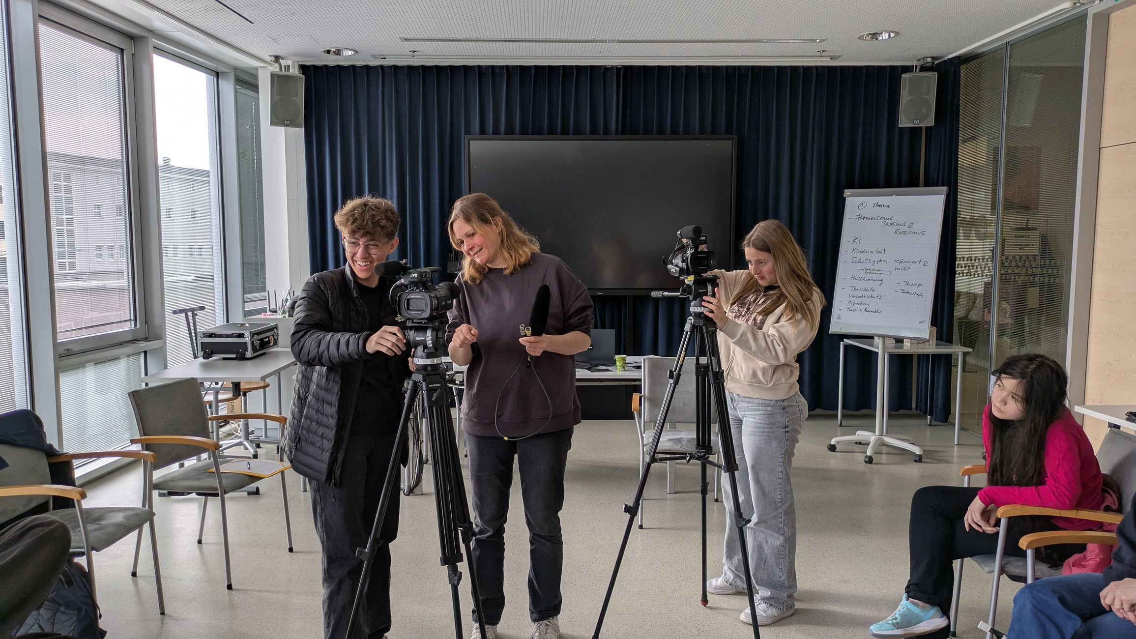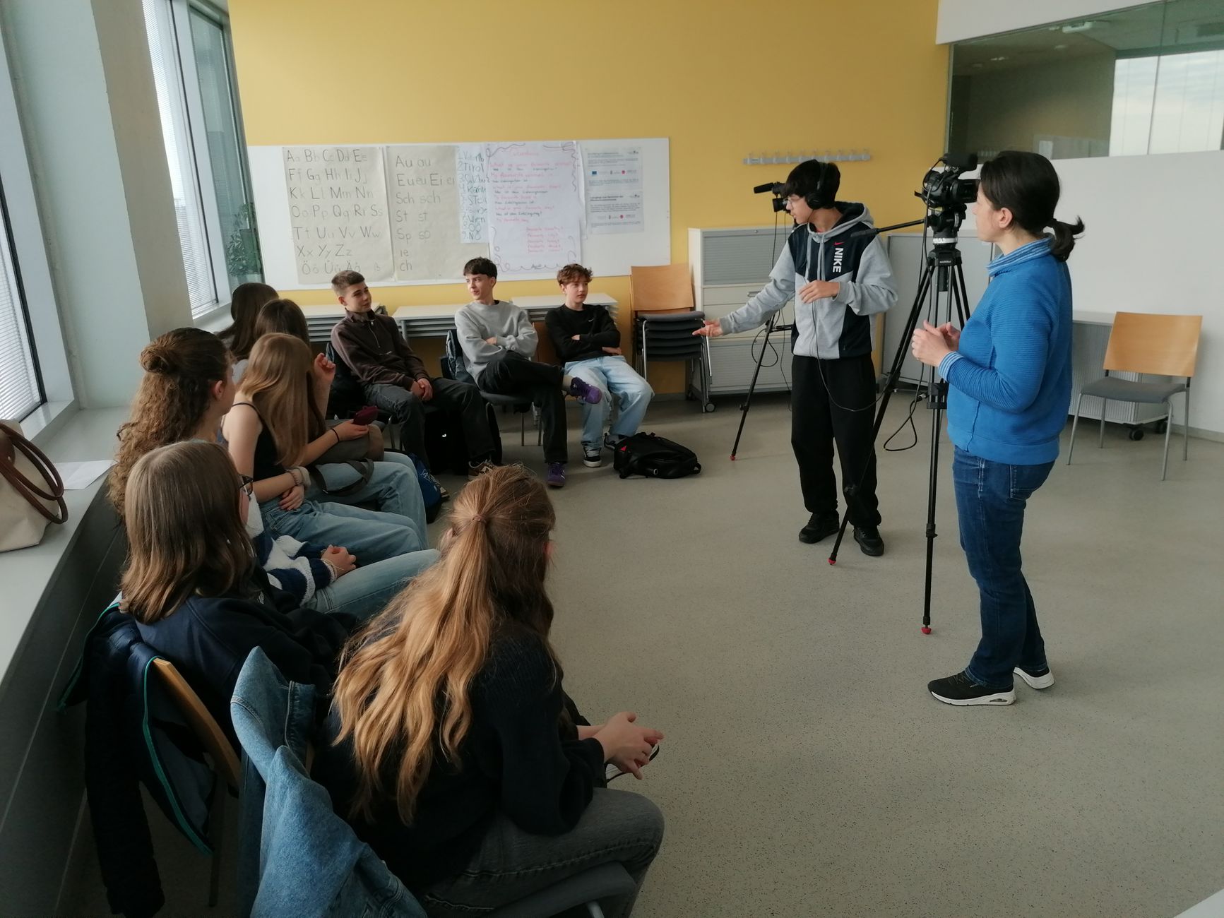 Der Workshop begann mit einer Einführung in die Inhalte Kameratechnik, Bildausschnitt und Interviewführung. Im Anschluss an eine Übungsphase mit professionellen TV-Kameras, lag der Fokus auf der Themensuche. Da die Palette an Ideen sehr umfangreich war, gestaltete sich diese anfangs schwierig. Nach einiger Zeit kristallisierten sich jedoch die beiden oben erwähnten Bereiche heraus. Nachdem anregende Fragen diskutiert worden waren, machten sich die Filmteams auf die Suche nach Interviewpartner*innen. Abschließend wurden die Clips dann noch geschnitten und zu den Beiträgen zusammengestellt. Diese können durch einen Klick auf die beiden Links aufgerufen werden.