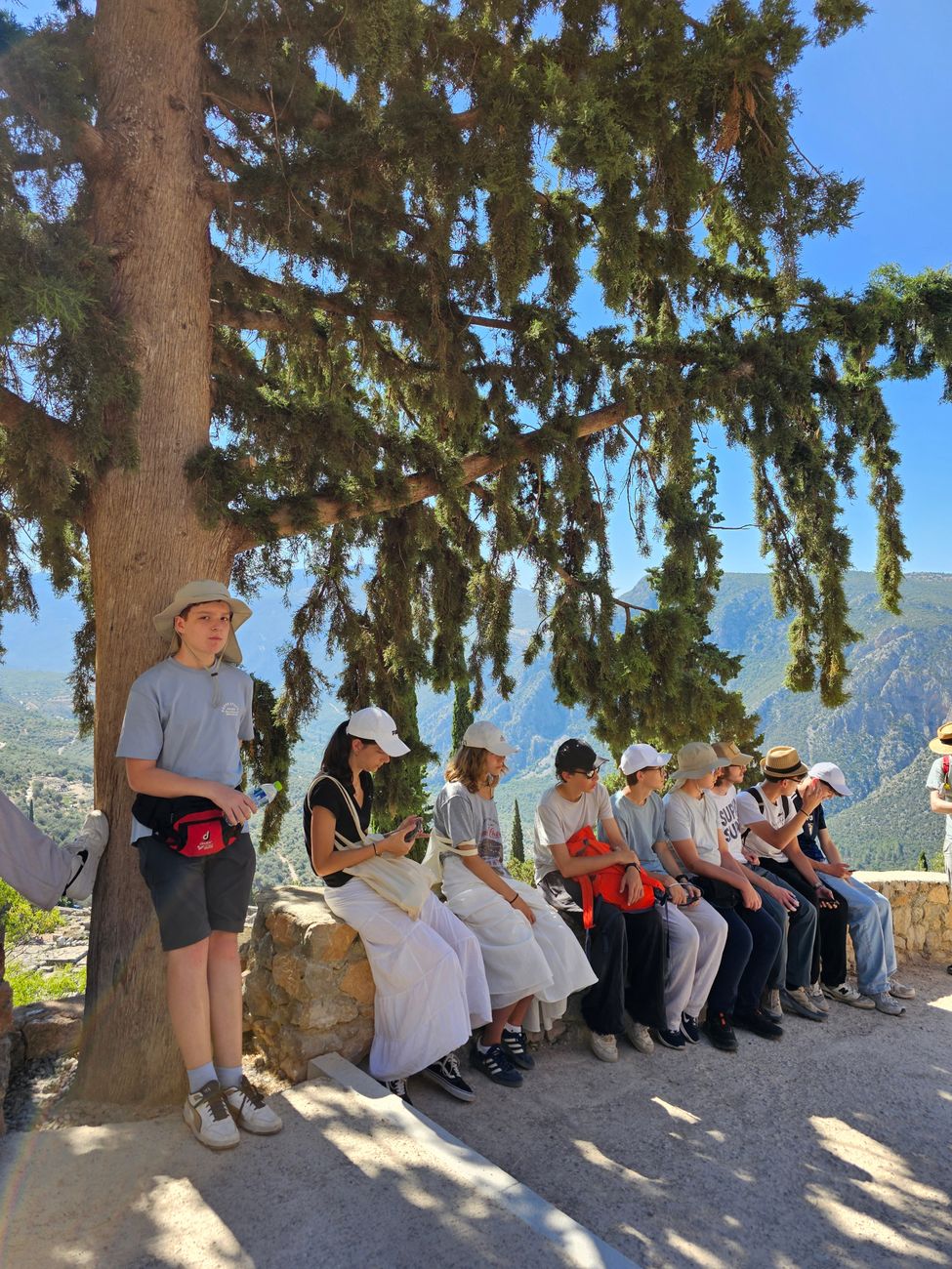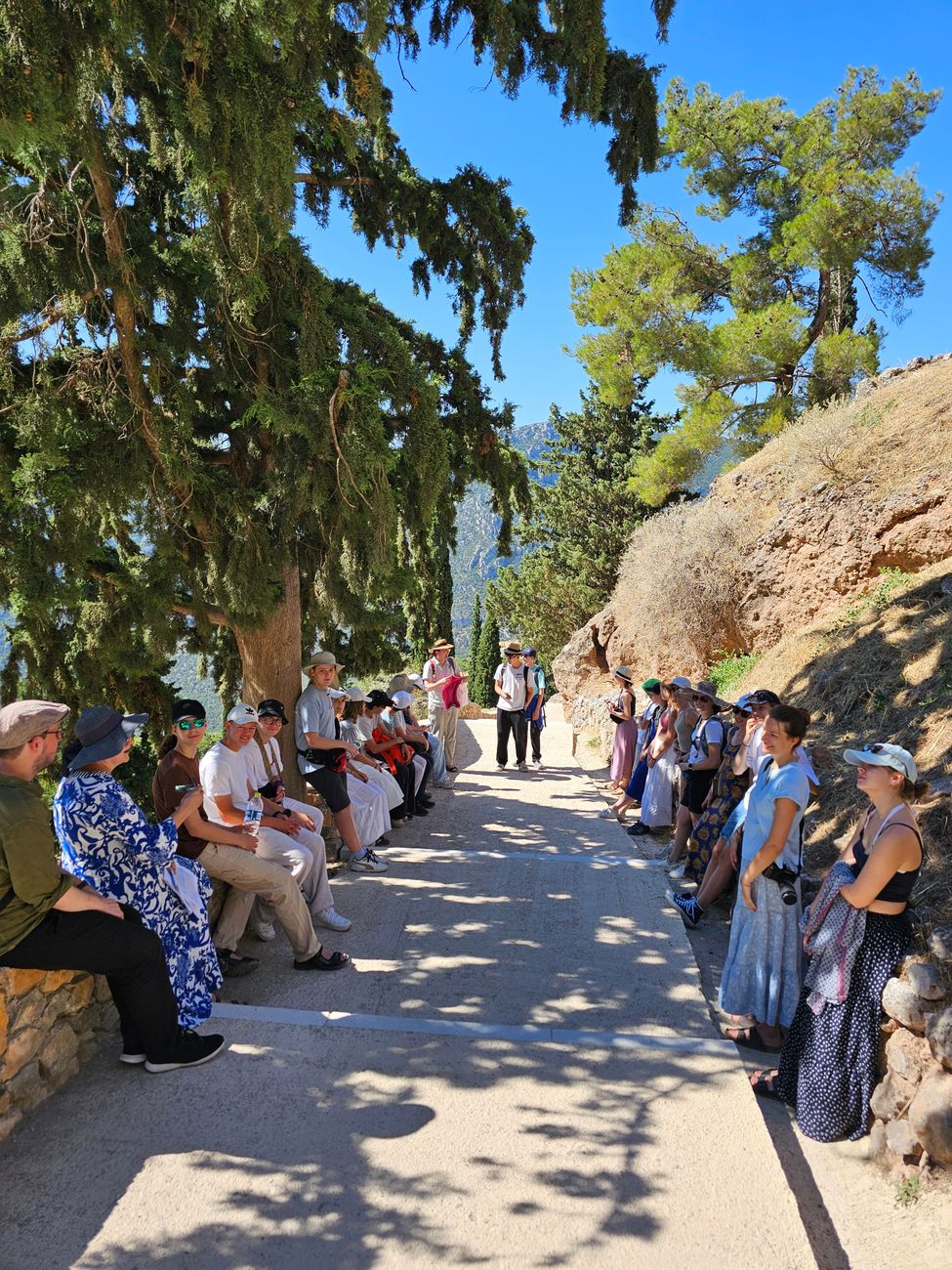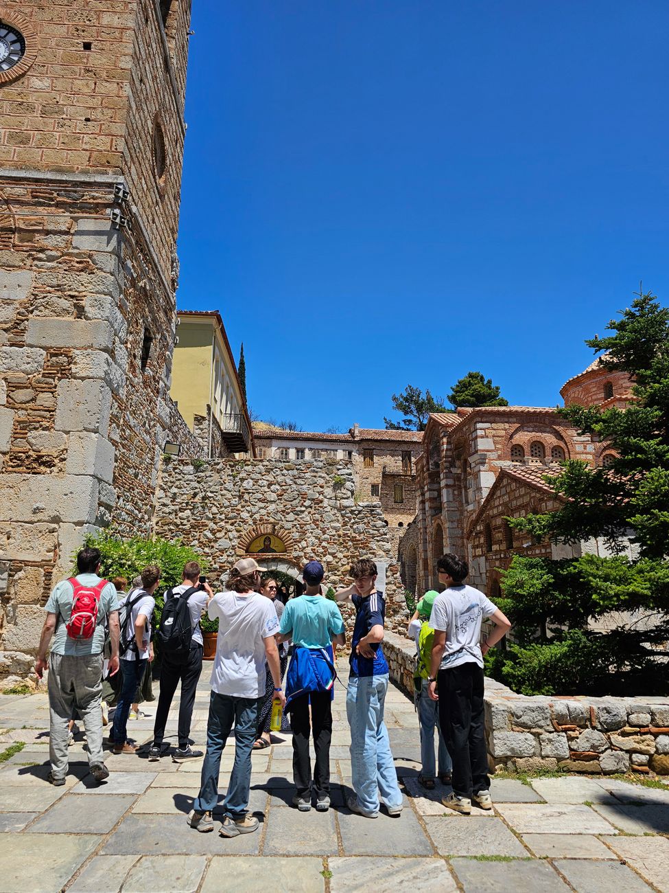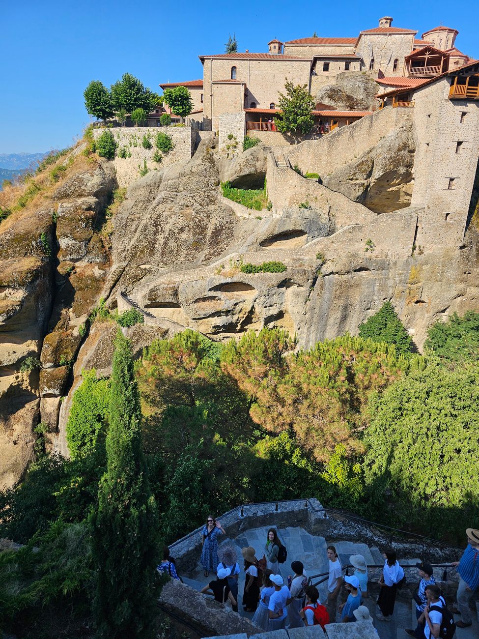 Hinauf geht es am Morgen ins Kloster Megálo Metéoro, wo uns Frau Prof. Cerwenka nach einem kurzen (Rest-)Aufstieg, wo wir das atemberaubende Panorama bestaunen dürfen, die Besonderheiten des Klosters näherbringt, die Motivik der Wand- und Deckenfresken, den Aufbau des Klosters und seine Geschichte. Auch ein zweites, kleineres Kloster liegt noch auf unserem Weg, bevor unsere Reise schon weiter nach Süden in Richtung Delphi geht, um das nächste Orakel zu befragen.
