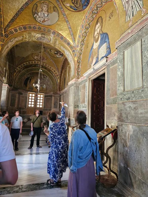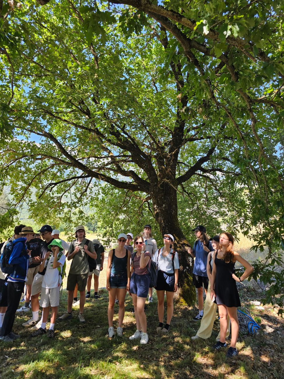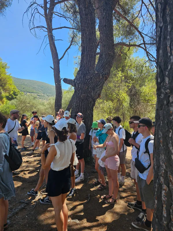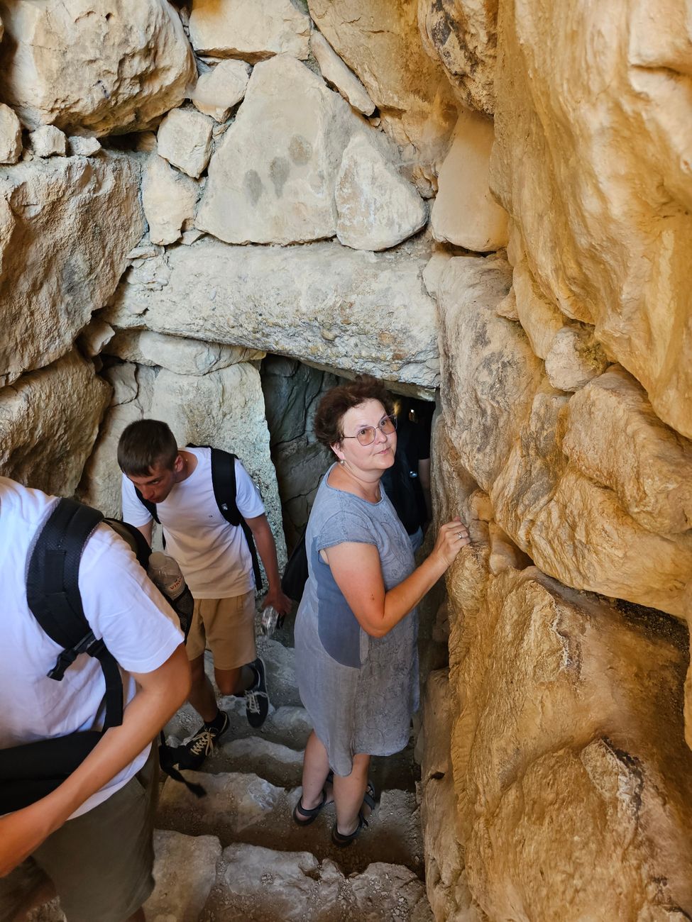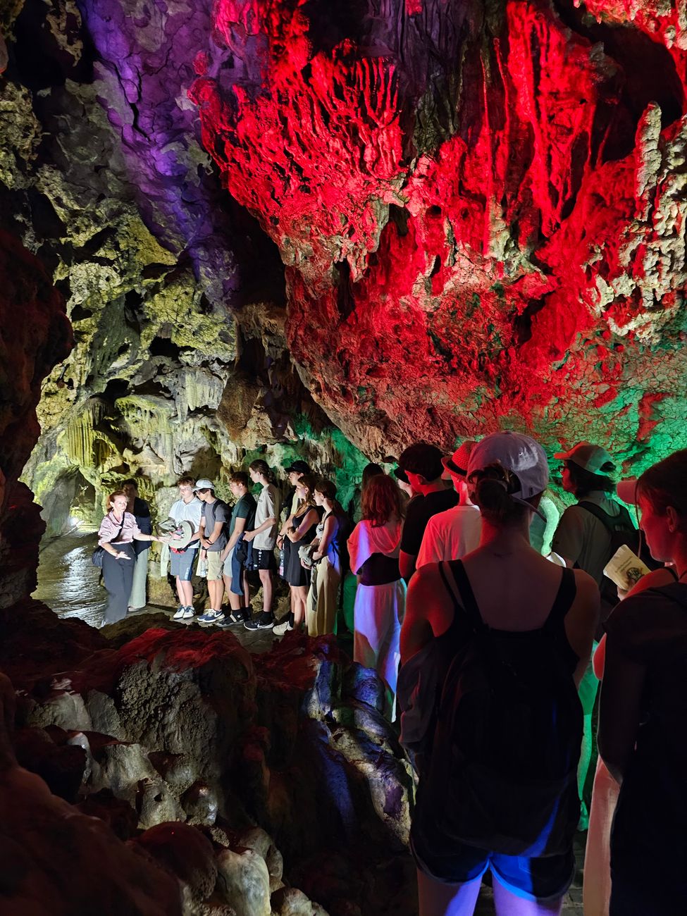 Hinauf geht es am Morgen ins Kloster Megálo Metéoro, wo uns Frau Prof. Cerwenka nach einem kurzen (Rest-)Aufstieg, wo wir das atemberaubende Panorama bestaunen dürfen, die Besonderheiten des Klosters näherbringt, die Motivik der Wand- und Deckenfresken, den Aufbau des Klosters und seine Geschichte. Auch ein zweites, kleineres Kloster liegt noch auf unserem Weg, bevor unsere Reise schon weiter nach Süden in Richtung Delphi geht, um das nächste Orakel zu befragen.