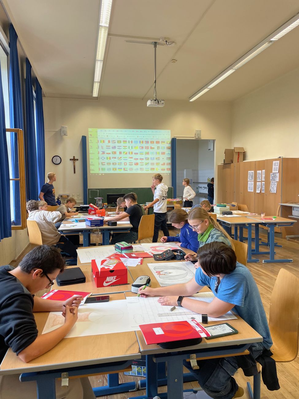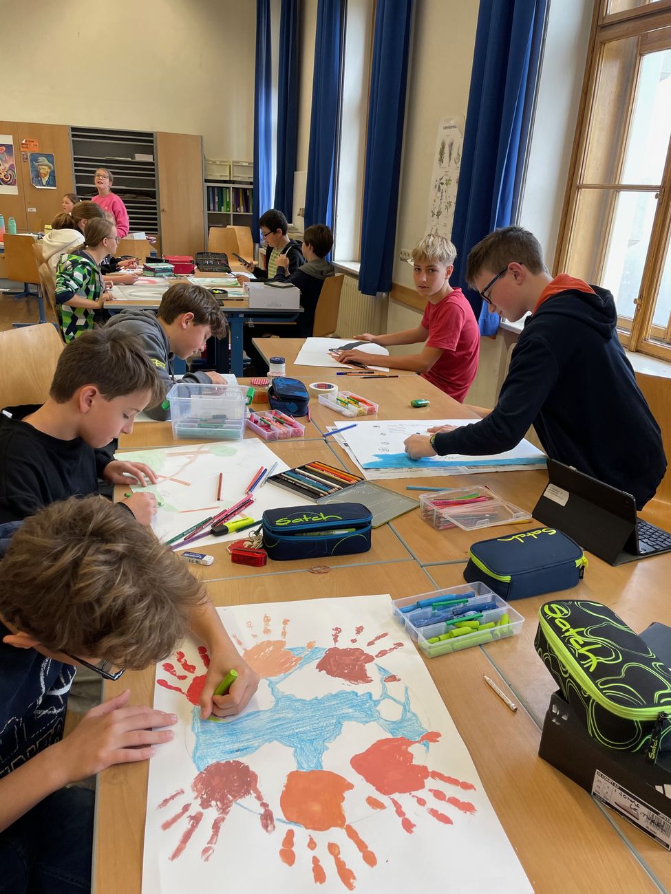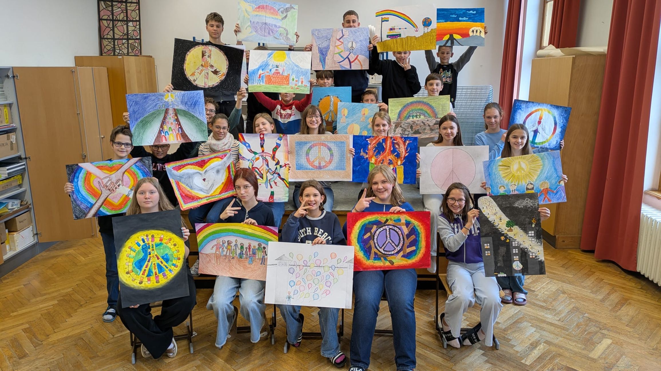 Die Schüler:innen der Klassen 3B und 3D nahmen am weltweiten Lions Club Friedensplakatwettbewerb teil und setzten sich dabei kreativ mit dem Thema „Gemeinsam sind wir eins“ auseinander. In ihren Plakaten zeigen sie eindrucksvoll, dass Frieden im Kleinen beginnt, durch Zusammenhalt, gegenseitige Unterstützung und gemeinsames Gestalten. Die Umsetzung eigener Ideen auf großem Format war eine besondere Herausforderung, die alle mit Engagement, Einfühlungsvermögen und Teamgeist meisterten. Zum Einsatz kamen vielfältige Materialien von Acrylfarben über Wachskreiden bis hin zu Farbstiften und Wasserfarben. Der Fantasie waren keine Grenzen gesetzt.