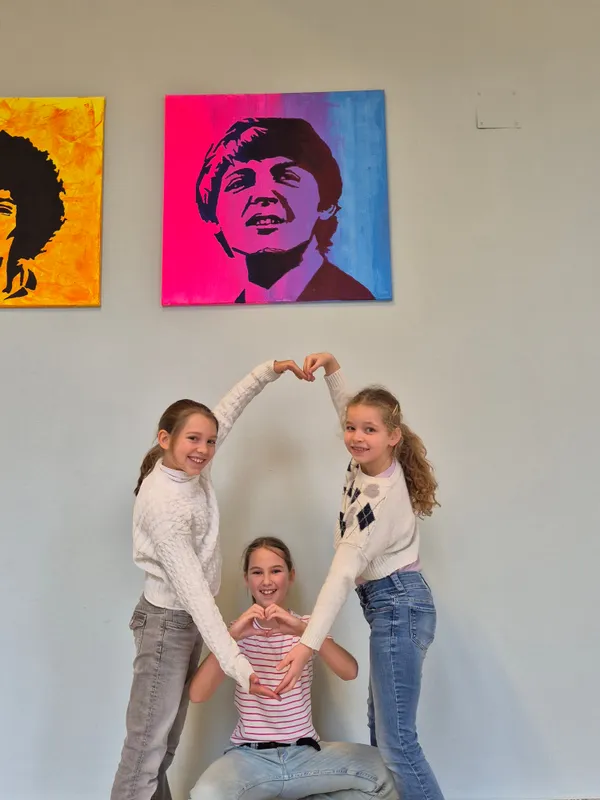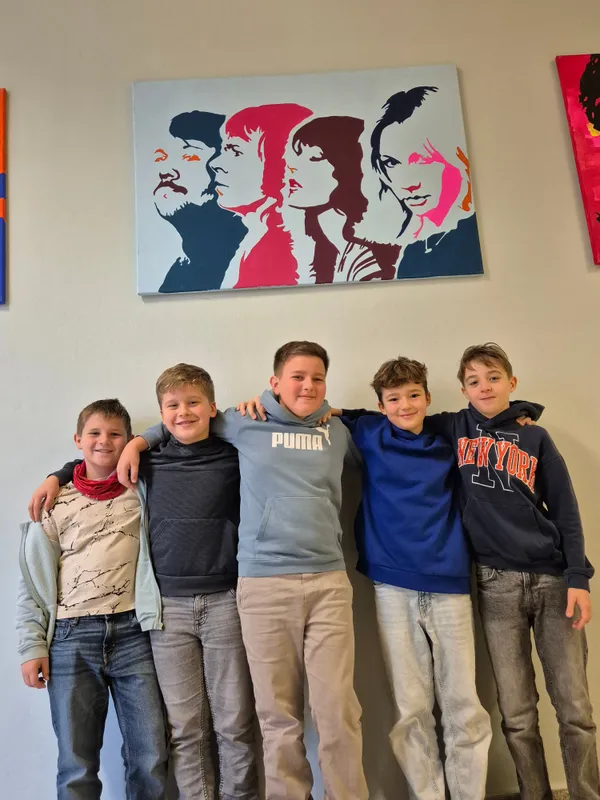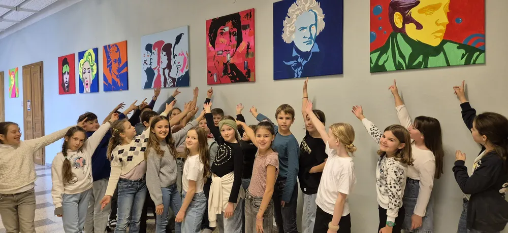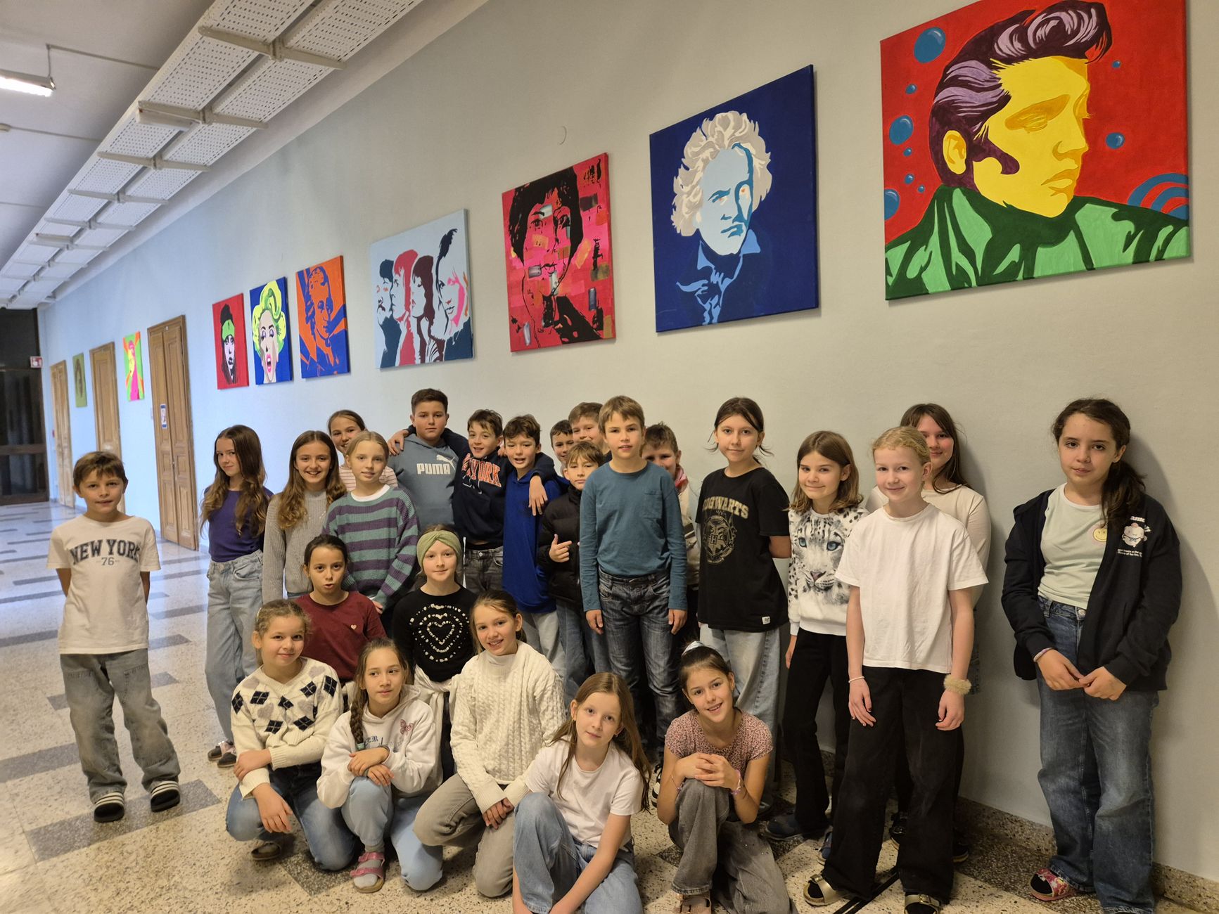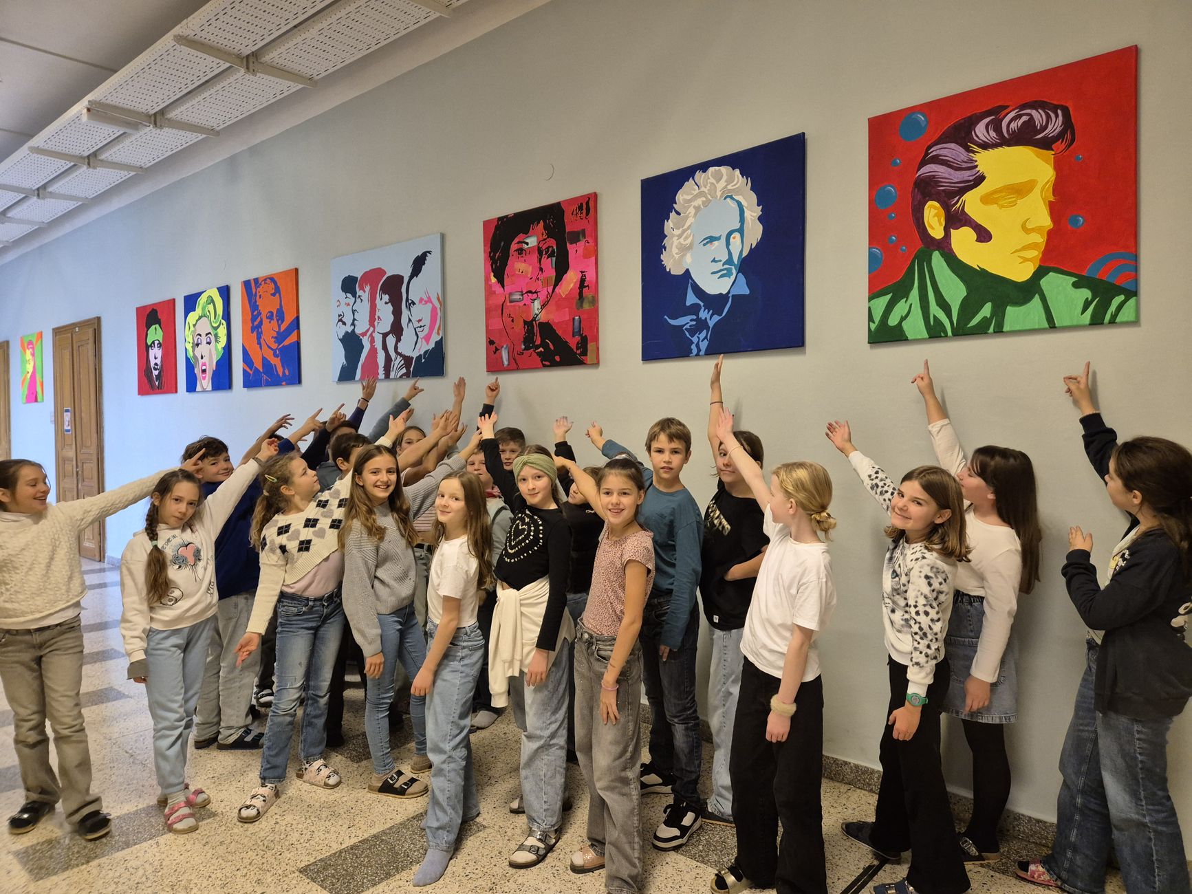 Die Gänge vor den Musiksälen sind in neue Farbe getaucht und bunt aufgefrischt! Die 1a-Klasse begutachtet und bewundert die im PopArt-Design gestalteten Musikerinnen und Musiker!