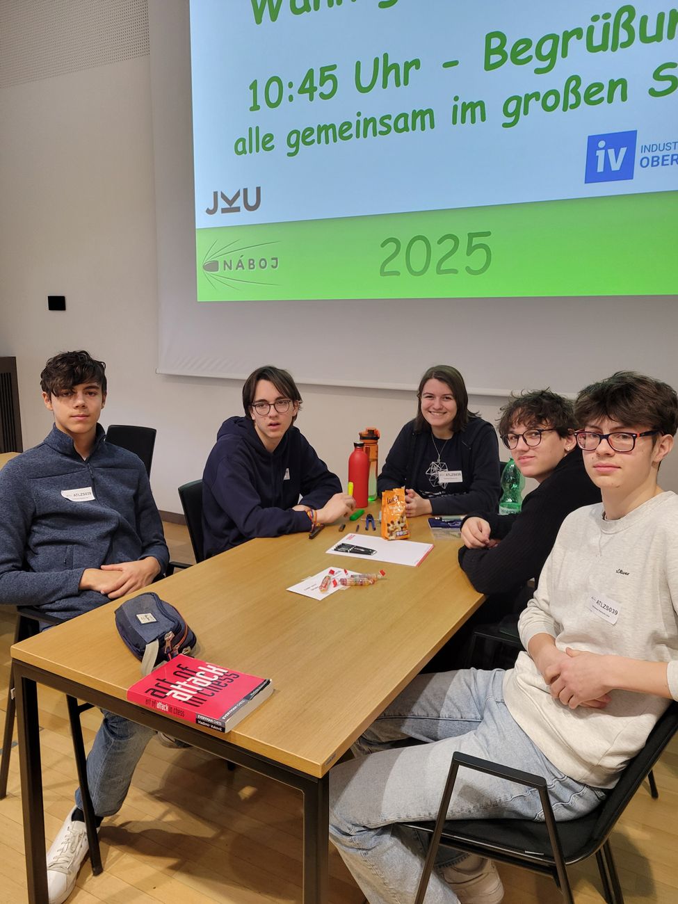 Maxi Fischer (7A), Judith Haderer (7A), Simon Hahn (6B), Jonathan Hohenwallner (7A) und Petar Popov (6B) waren nicht nur sehr erfolgreich beim diesjährigen Naboj-Wettbewerb an der Linzer JKU, sondern hatten vor allem auch eine Menge Spaß beim Überlegen, Tüfteln, Rechnen und Laufen (Schließlich ging es ja auch um die Zeit!). Mit 19 richtigen Lösungen erreichten sie in der mit 40 angetretenen Teams sehr stark besetzten "Senioren"-Kategorie außerdem nur um zwei weniger als das Siegerteam.