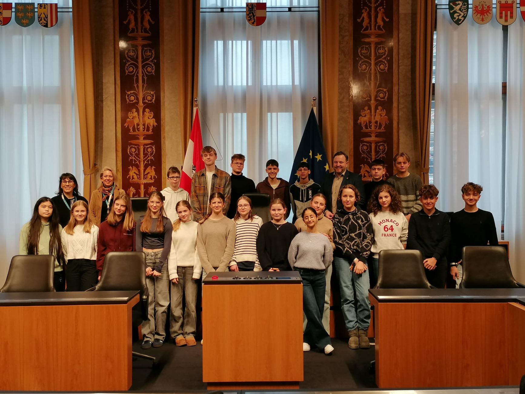 Im Anschluss empfing uns Hr. Bundesrat Franz Ebner im Sitzungssaal des Bundesrates, wo die SchülerInnen ihre Chance nutzten und interessante Fragen zu Demokratie und Politik stellten.