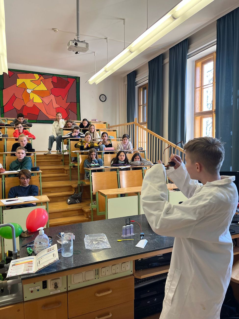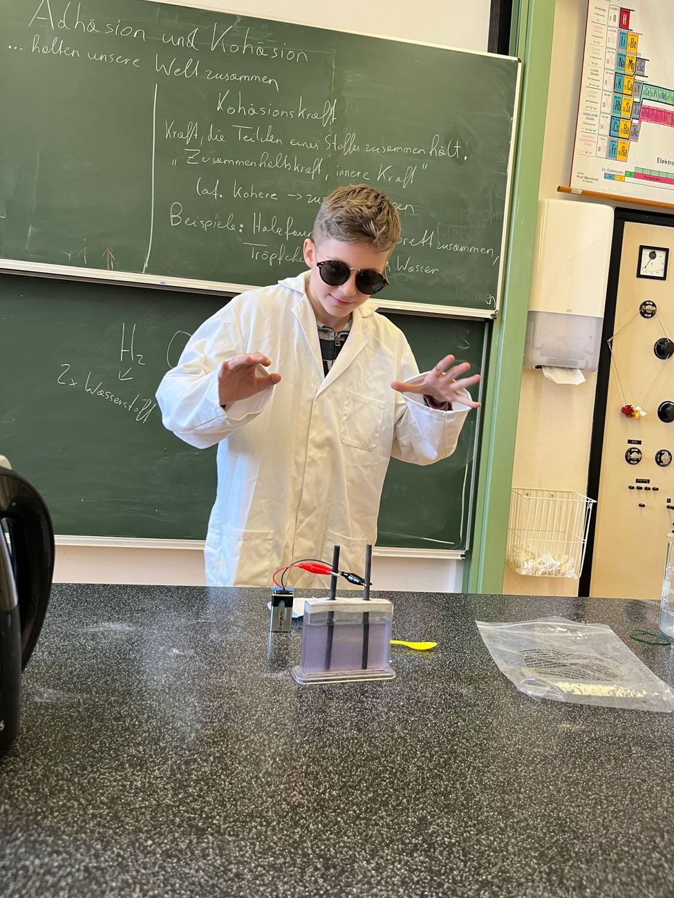 Wenn ein Schüler seinen Elektrolysebaukasten in die Schule mitnimmt, wird der Physikunterricht spontan auf den Kopf gestellt. Laborkittel und „Schutzbrille“ wechseln den Besitzer und die nächsten 20 Minuten unterrichtet Henrik anstelle des Lehrers die 3B. Er erklärt, wie Wasser durch elektrische Spannung in Sauerstoff und Wasserstoff getrennt wird und zeigt dabei einen spannenden Versuch. Es blubbert und brodelt, ein mysteriöses Gel färbt sich grün und rot - es explodiert aber, trotz der anfänglichen Skepsis so mancher Mitschüler:innen, zum Glück nichts! Vielen Dank für die Eigeninitiative – schön zu sehen, wie Physik begeistern kann.
