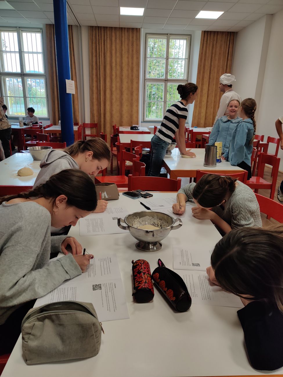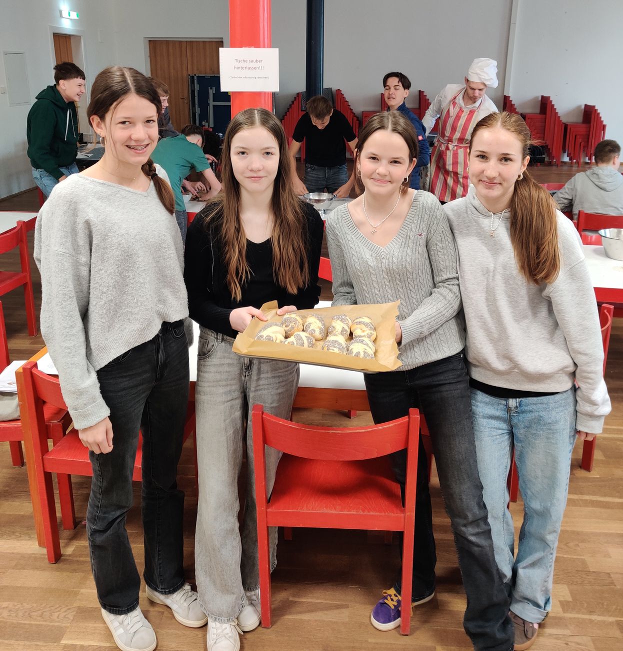 Wenn sich solche Szenen im Speisesaal des Petrinums abspielen, dann kann das nur bedeuten, dass der gesamte reguläre Unterricht abgesagt wurde und man stattdessen der Naturwissenschaft im Mohnflesserl frönt. Am 13. April hielt der Mohnflesserl-Mohntag Einzug im Petrinum. Sechs Einheiten lang widmeten sich die Schülerinnen und Schüler der 4C und 4D ganz und gar dem mohnhaltigen Gebäckstück.