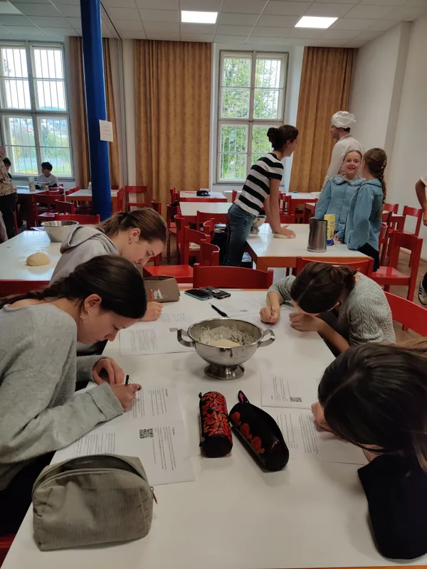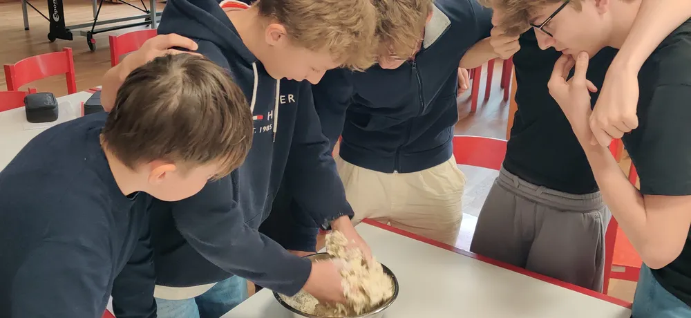 Vom Teig kneten, Flesserl formen bis zur Entstehung von Salz und dem Aufbau der menschlichen Verdauung stand der Wochenbeginn ganz im Zeichen der Teigware. Und während im Speisesaal geknetet, aber auch die Adhäsionskraft und Kapillarwirkung der Mohnkörner am Teigrohling analysiert wurde, ging es im Biologiesaal der Hefe an den Kragen. Mit Zucker und warmem Wasser wurde sie wachgeküsst. Nur um kurze Zeit später schon als Objekt der Begierde auf dem Objektträger zu landen und durchleuchtet zu werden. Kein Wunder, dass manchem da die Worte fehlten. „Können Sie mir bitte schnell das Silberdings geben“, lautete die Frage eines Schülers. Er war auf der Suche nach dem Tablett, um die Flesserl der ganzen Gruppe einzuschießen.