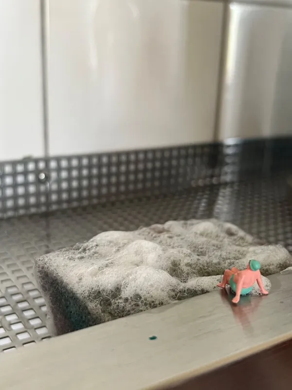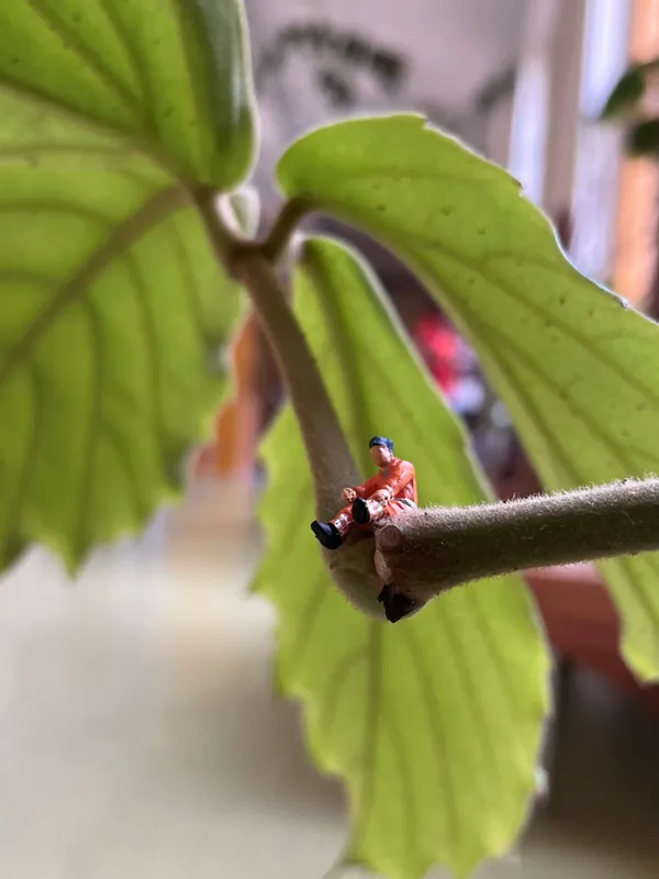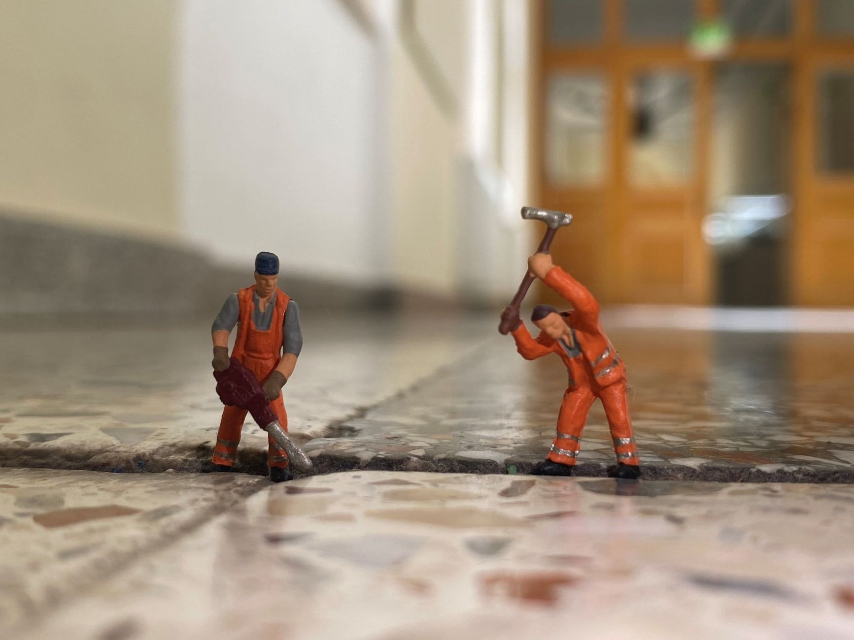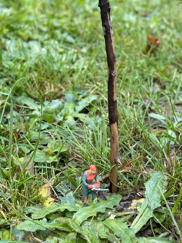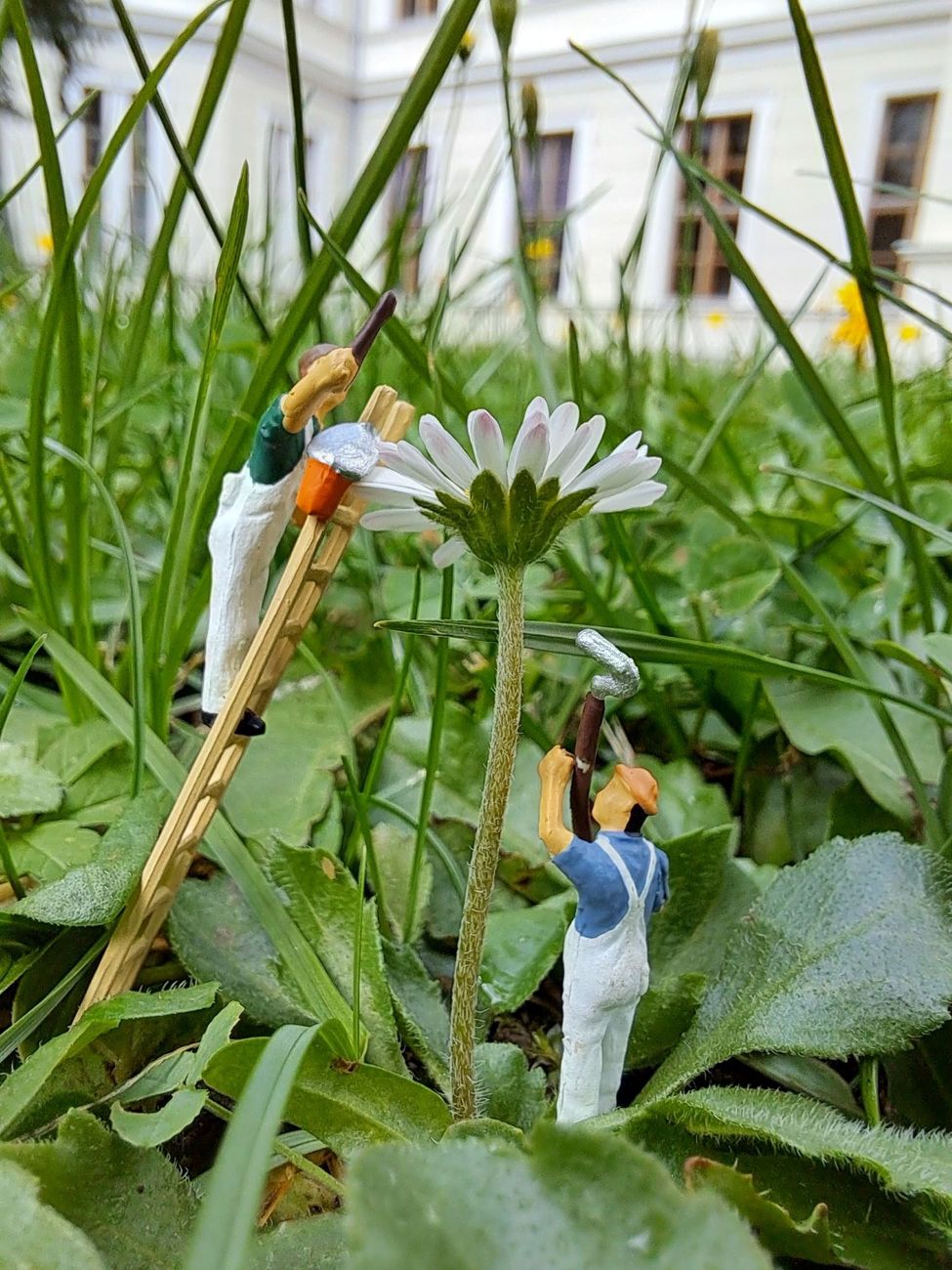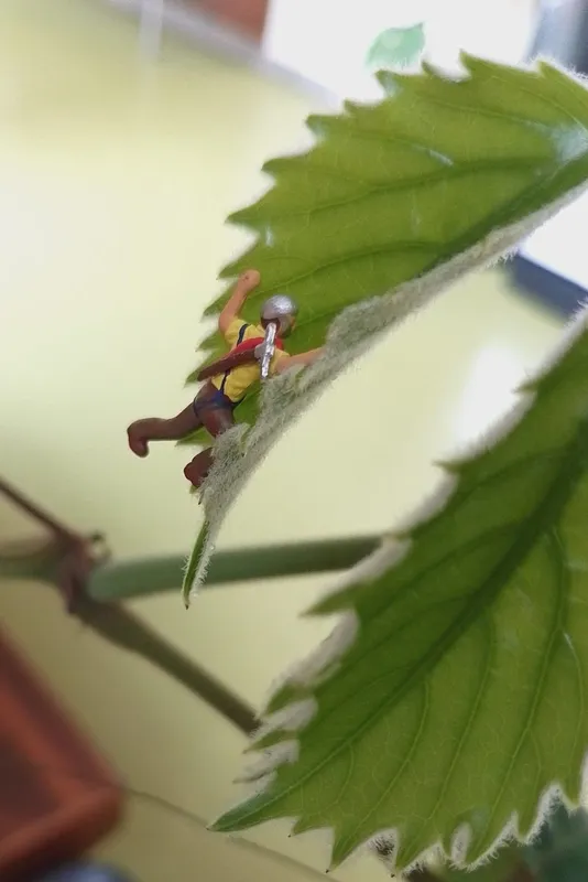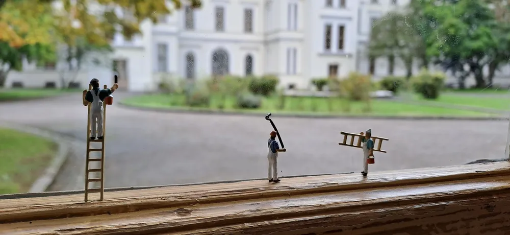 Knapp zwei Zentimeter große Modelleisenbahnfiguren wurden von den Schüler*innen im und rund um das Petrinum in neuem Kontext arrangiert und mit Nahaufnahmen festgehalten.