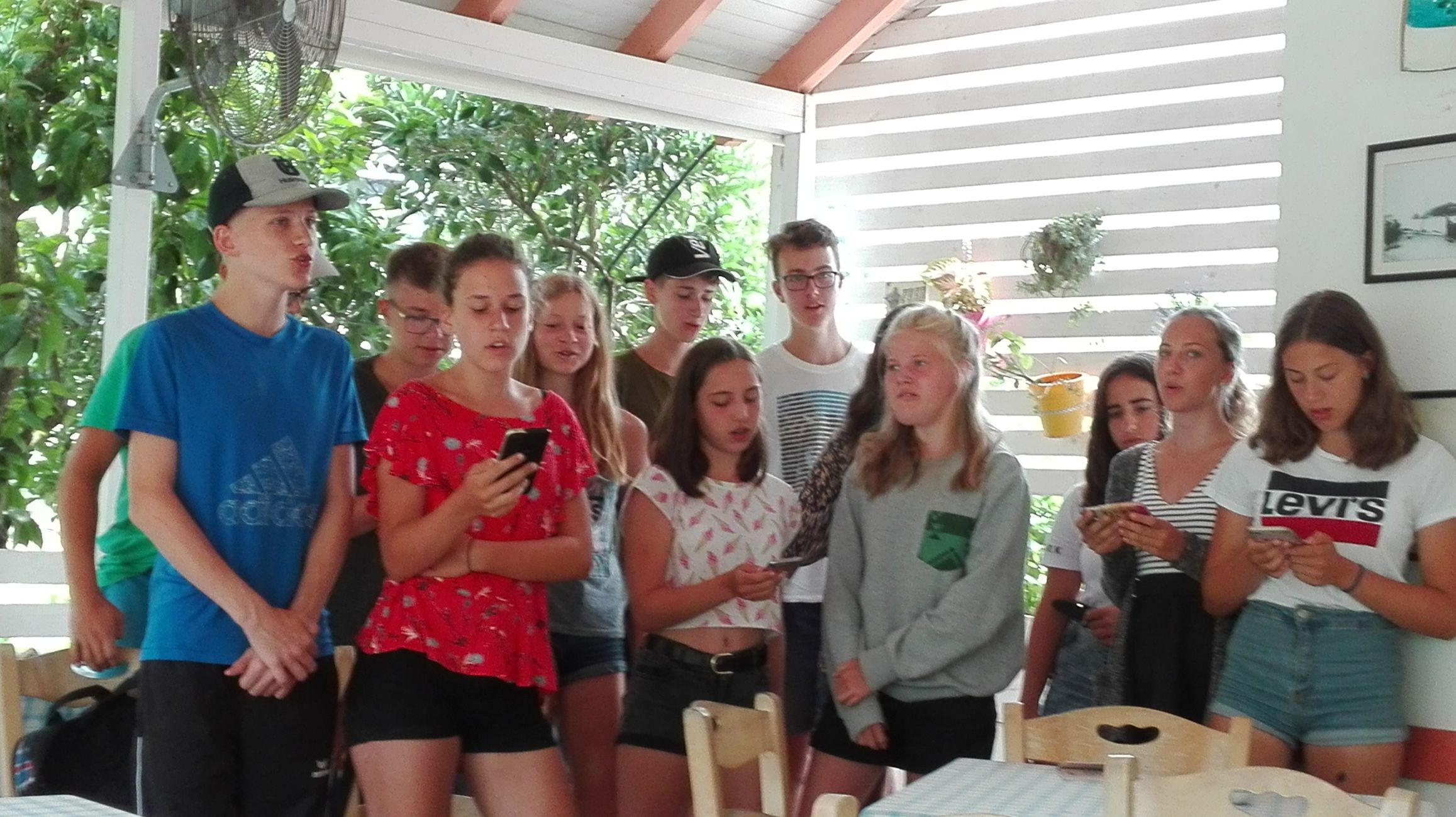 Ausgestattet mit den altbewährten Unterlagen und zusätzlichen, neuen Unterrichtsmaterialen in Form von unzähligen Dialogkärtchen (von Kollegin Cerwenka mühevoll und engagiert ausgearbeitet), konnten die Lehrkräfte Alexia, Irini Lambrakis und Heribert Derndorfer, der dankenswerter Weise spontan für die in Karenz befindliche Alexandra eingesprungen ist, den täglichen Vormittagsunterricht im Freien trotz zunehmender Hitze und immer stärker werdendem Lärmpegel durch die Zikaden kurzweilig durchführen.