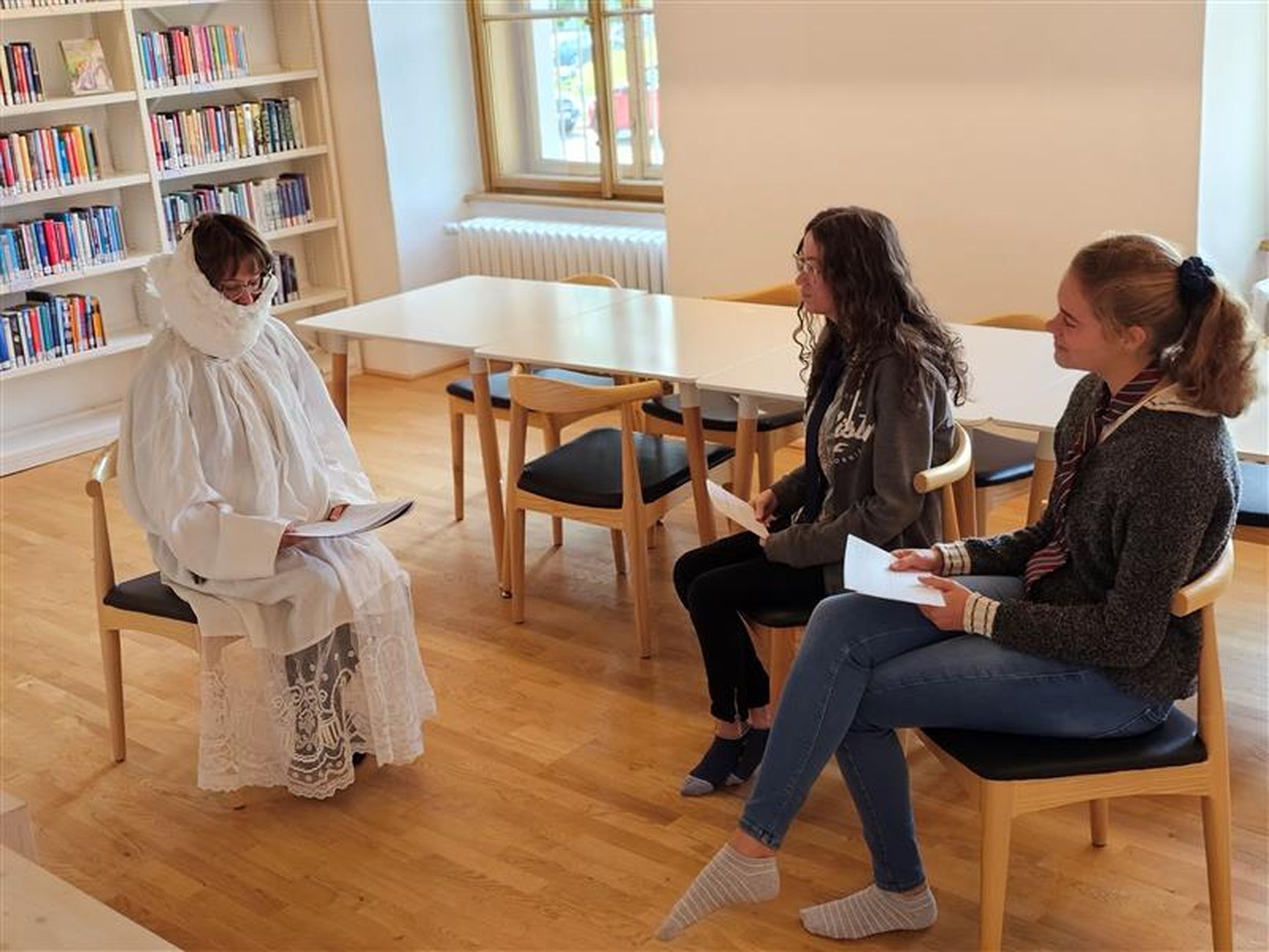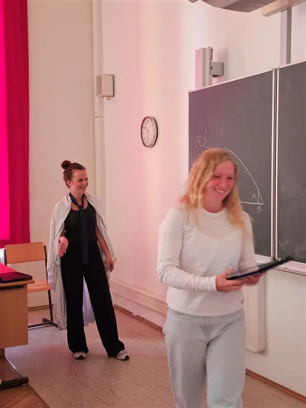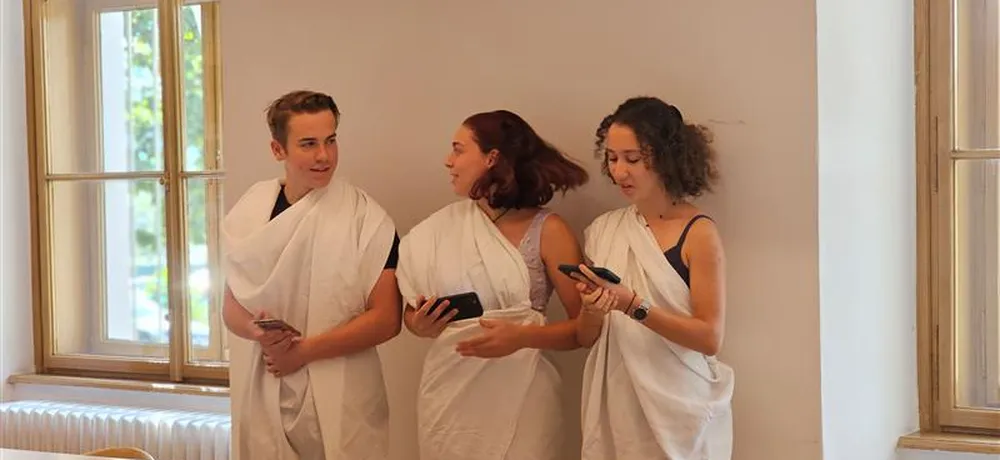 Die Schüler*innen schlüpften zuerst in die Rolle griechischer Philosophen und zeigten in kleinen Szenen die Kernthemen und -überzeugungen großer Denker wie Thales, Sokrates und Platon. So eröffnete sich eine Welt voller Fragen, die die Menschen von der Antike bis heute beschäftigen und bewegen. Einige davon stellten wir in den Mittelpunkt unserer Überlegungen: